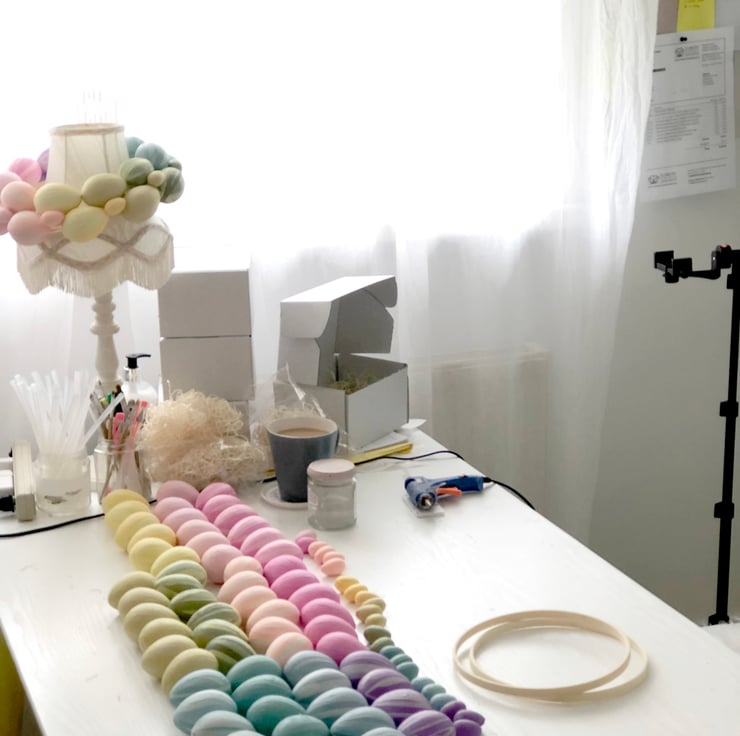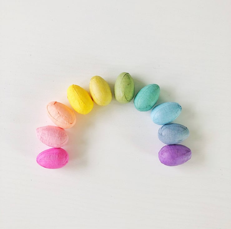 Each egg, measuring around 6cm, is covered in premium Italian crepe paper which has brilliant colours. I hand cut the strips of paper then glue them one by one to create a unique texture that almost resembles watercolour brush strokes. I put them together into a bamboo wreath and finally secured in place with the help of hot glue sticks.