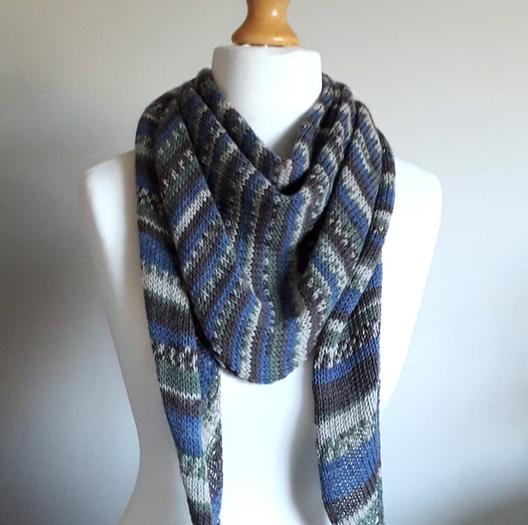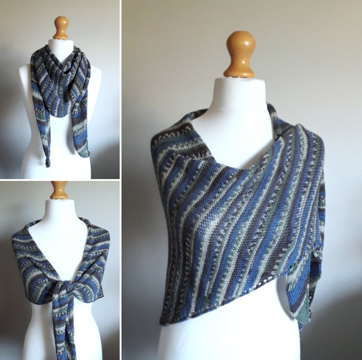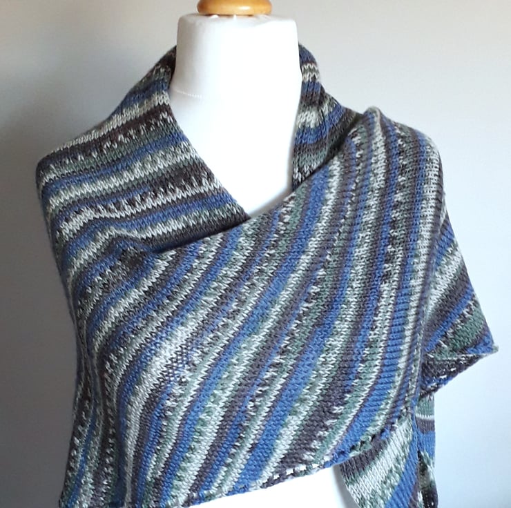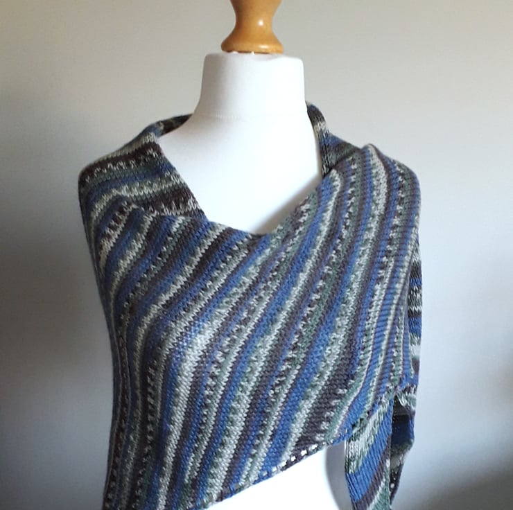 This triangular shawl has been lovingly knitted on a hand operated knitting machine in shades of blue and green and features eyelets along two sides for a decorative finish.