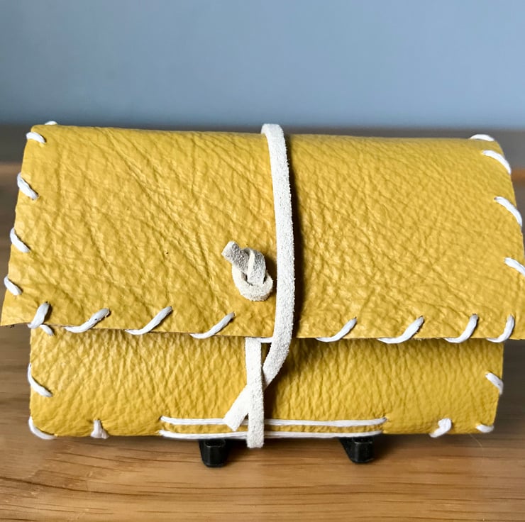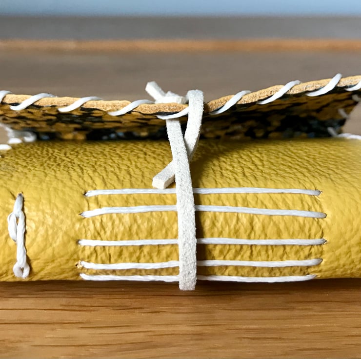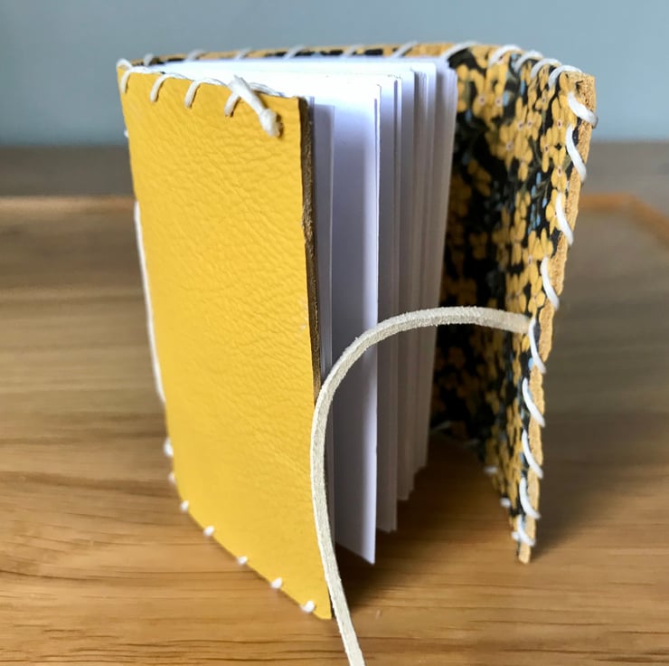 A lovely thick yellow leather with a stunning bight yellow floral fabric lining. The notebook is hand stitched around the edge with a white coloured thread and contains 120 blank sheets of plain paper which are then hand stitched to the leather in 5 signatures. The notebook is fastened with a light coloured suede cord tied loosely at the front.