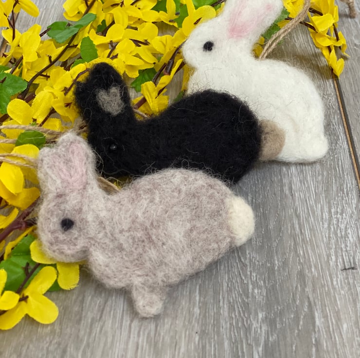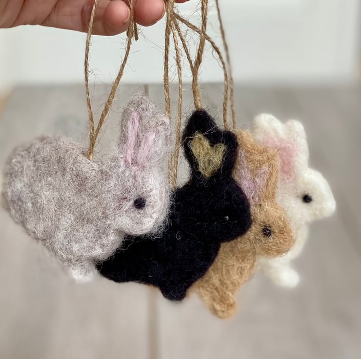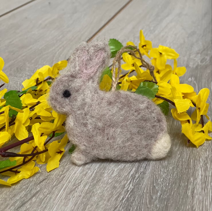 Hand needle felted using sustainably sourced wool and natural twine. Cute bunny in a soft ash grey with little pink ears and cotton puff tail.