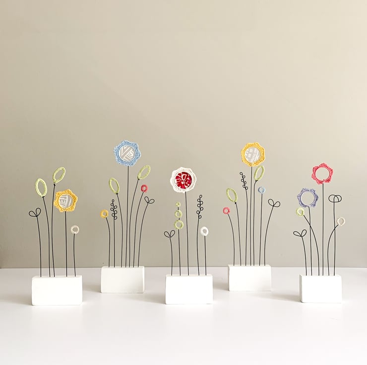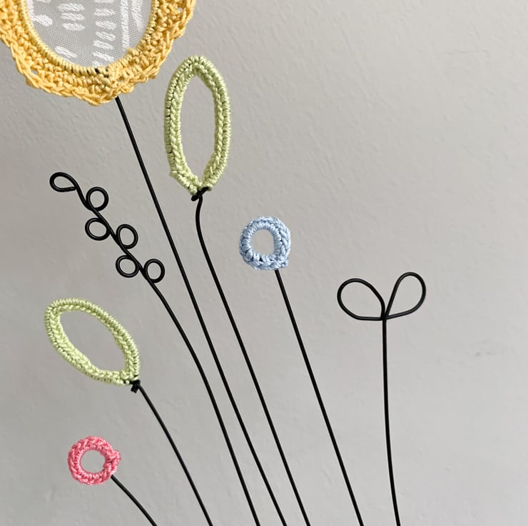 Wire flower stems with cotton crocheted flower heads add cheer to any space.