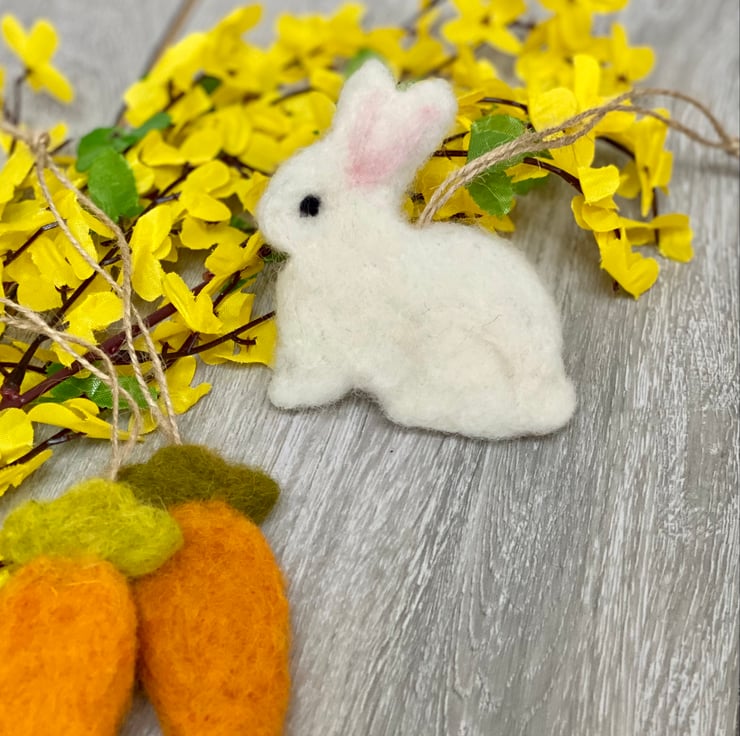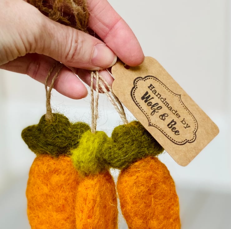 The bunnies need to eat! Three needle felted carrots to keep them going, that will look cute hanging next to your bunny or just on their own!