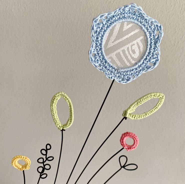 Wire flower stems with cotton crocheted flower heads add cheer to any space.