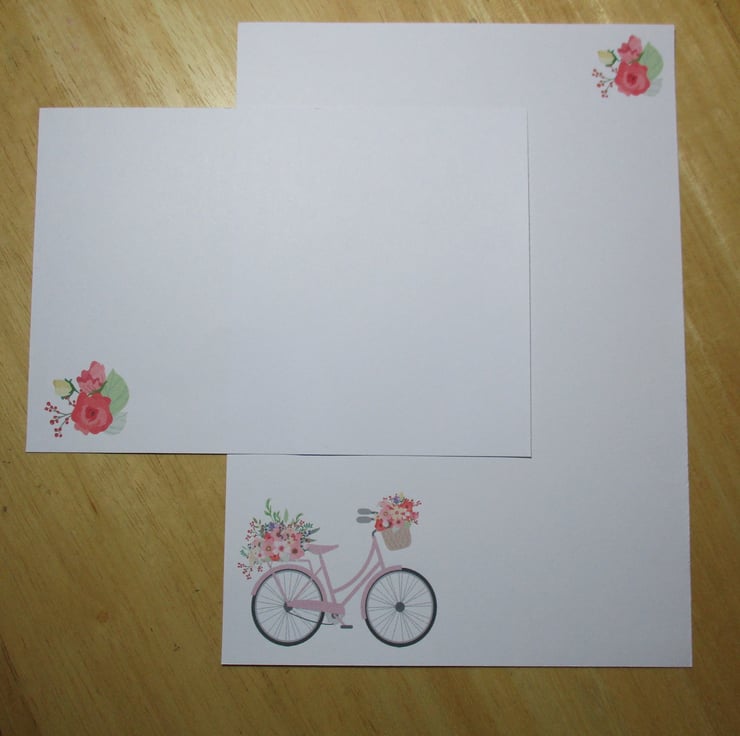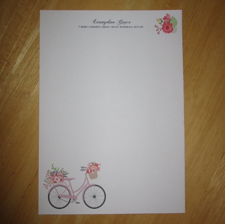 Floral bicycle design, 15 piece writing paper set with optional personalisation.
