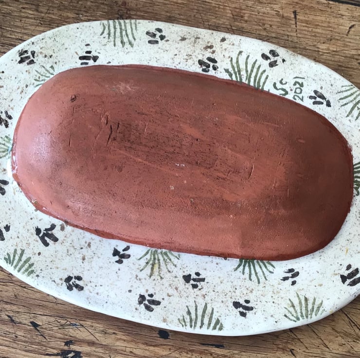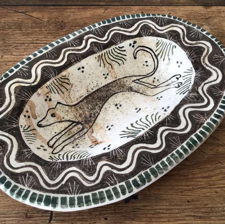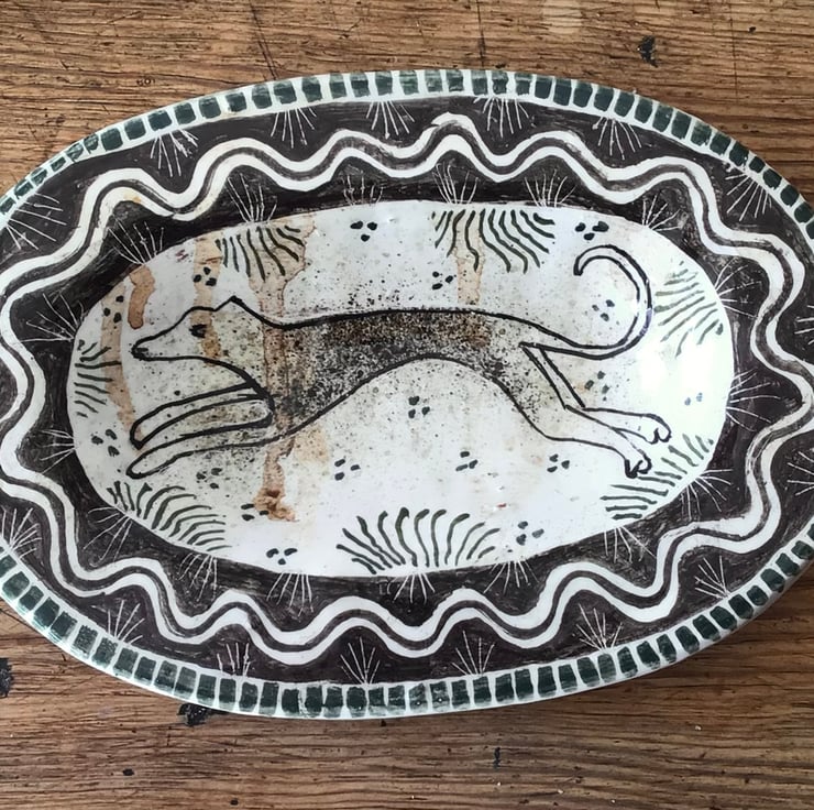 Oval earthenware dish with a hand painted greyhound design. Hand made by press moulding terracotta clay into an oval press mould. Decorated with underglaze oxides.