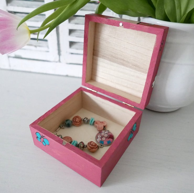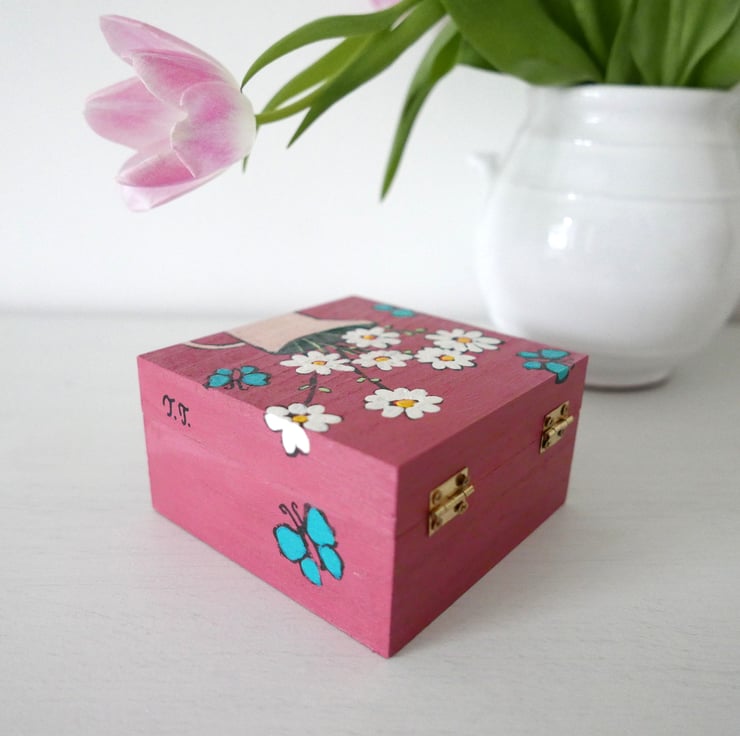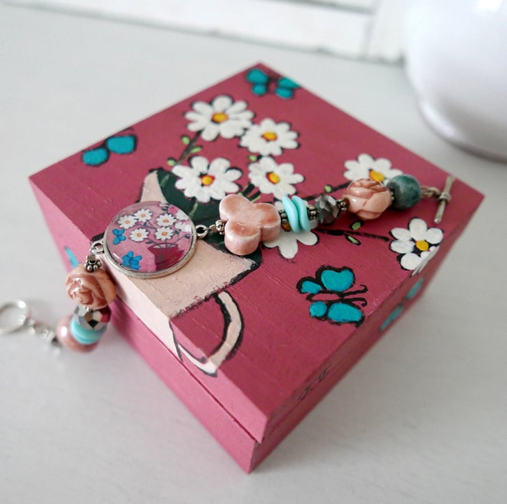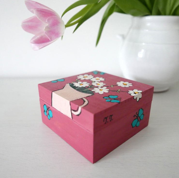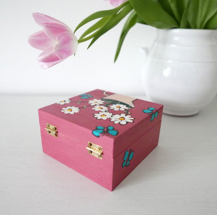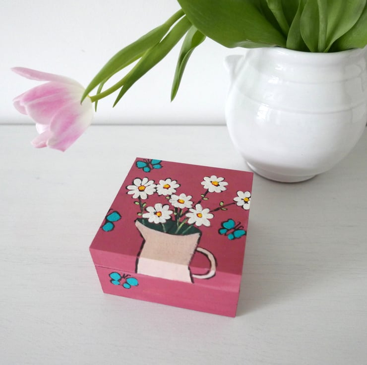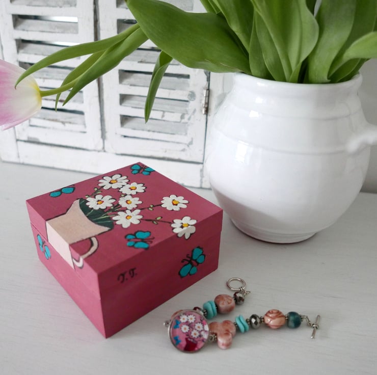 This listing is for this pretty dusty pink jewellery box with daisy artwork and turquoise butterflies. It is handpainted by me with acrylic paint and varnished for protection. It is an artwork and a functional object in one and it looks very pretty as part of your shabby chic decor. It measures approx 4.3" x 4.3" x 2.4" high.