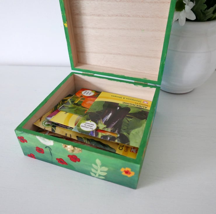 As a keen allotment owner, when I painted this box I thought of a storage idea to keep seeds packets. I know that many gardeners love meadows and this box could be the perfect gift for them. Also, when painting it, I imagined the meadow I wanted in my own garden and I am happy that the image turned out exactly how I imagined it. I hope you like it, too.