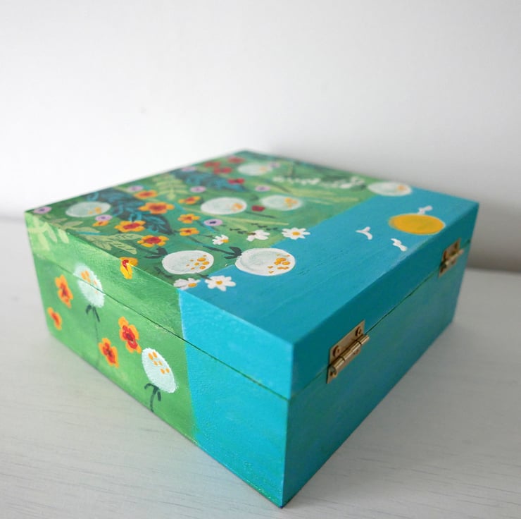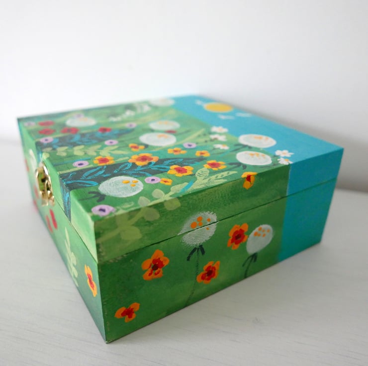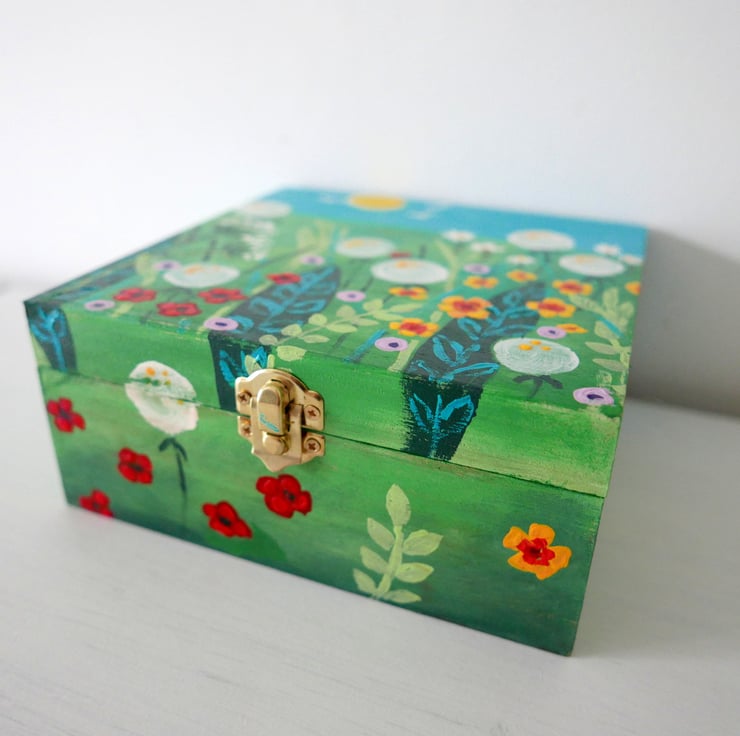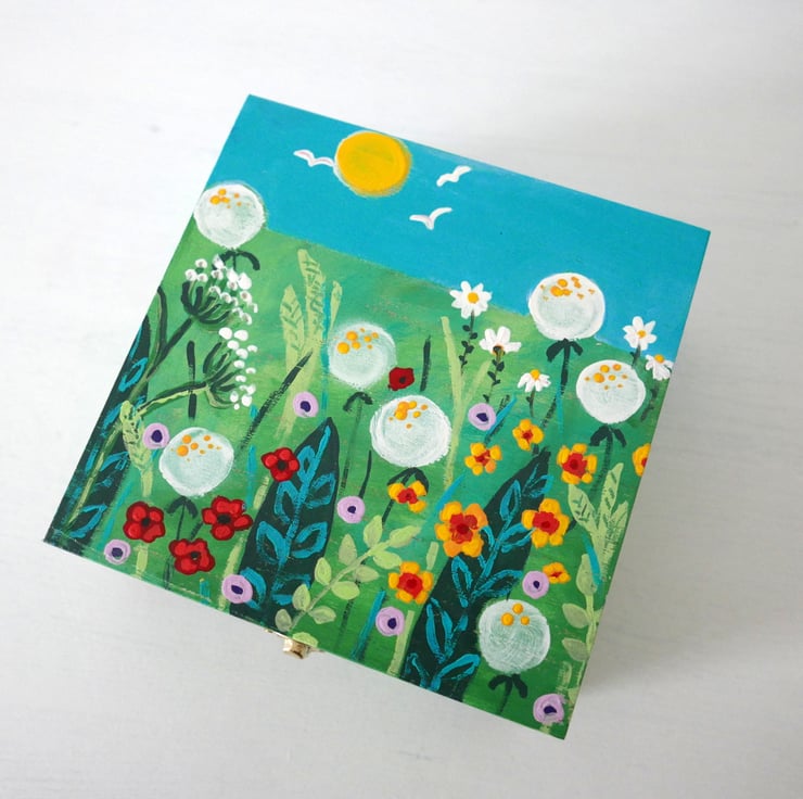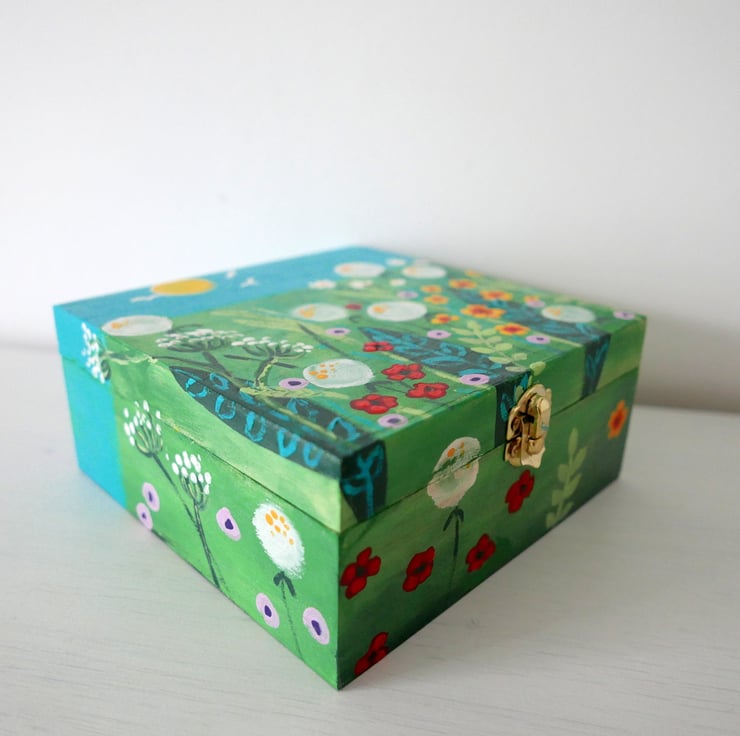 This box is an artwork in its own right. It is a storage box where you can put your craft supplies, small items or jewellery. But it is also an original painting featuring a meadow design with wildflowers and grasses against a green and turquoise background. The box is entirely hand-painted by me with acrylic paint and it is varnished for protection. Please note that it is not suitable to be used outside. The box measures 6.75" x 6.75" x 3" high.
