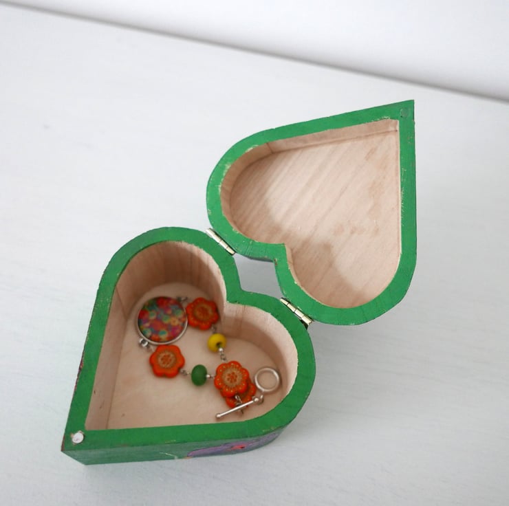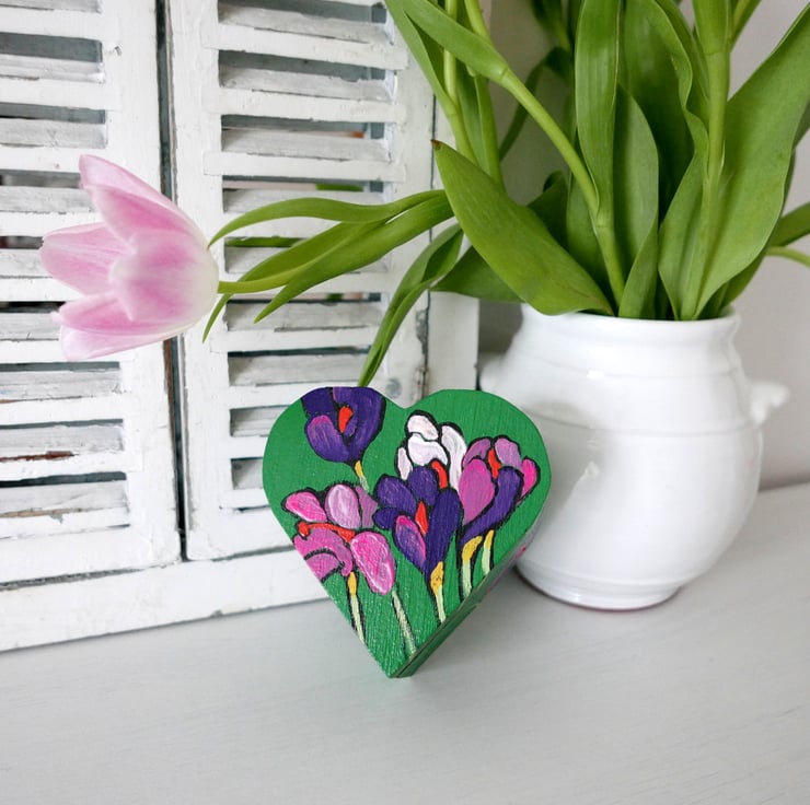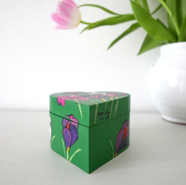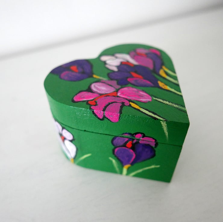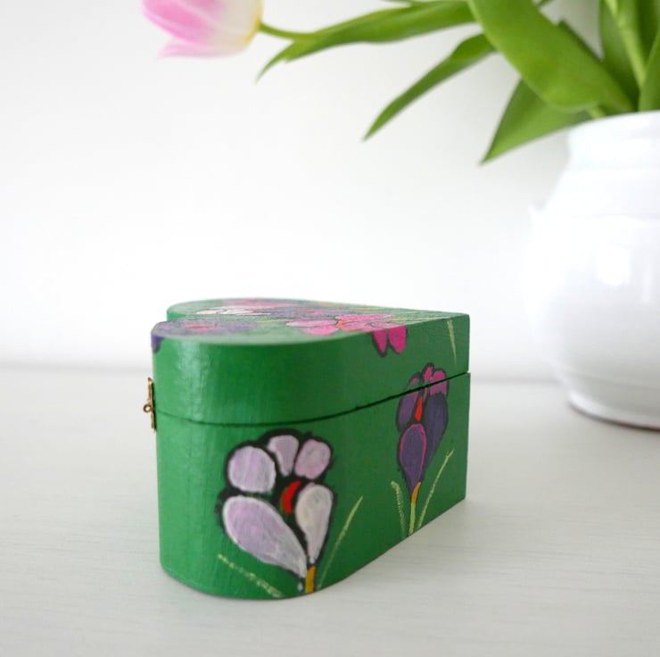 Crocus Painting, Heart Shaped jewellery Box, Green Storage Chest