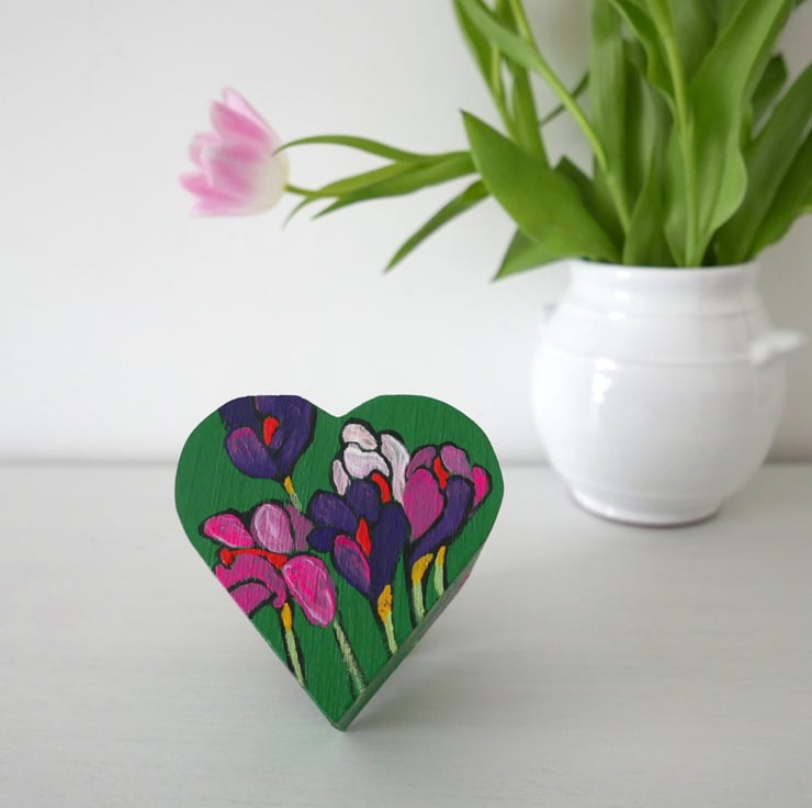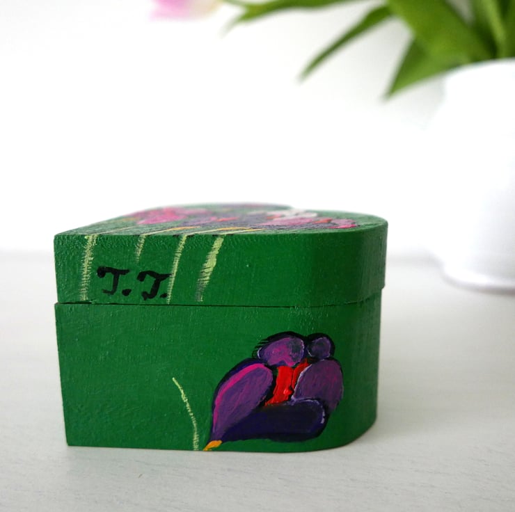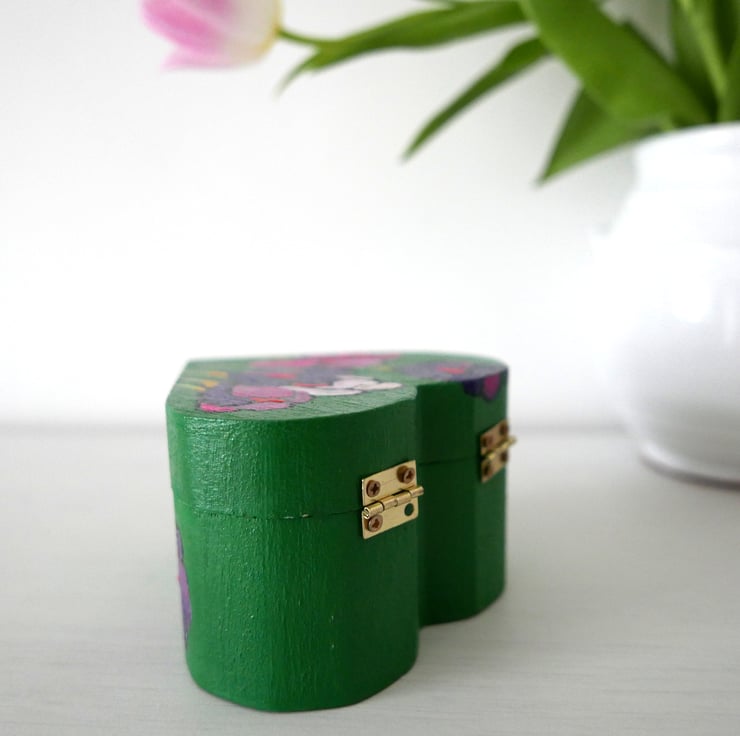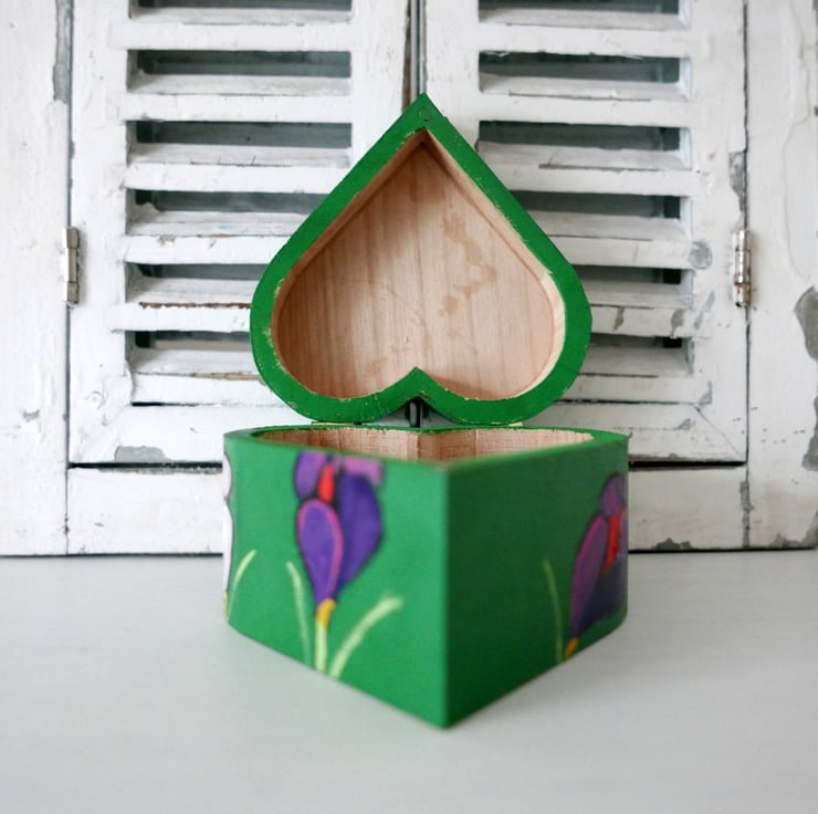 This listing is for this pretty crocus heart-shaped jewellery box which is entirely hand-painted by me with acrylic paint and varnished for protection. It features purple crocuses (inspired by my own garden) against a green grass-like background. I have always liked green and purple colour combination as it reminds me of spring. The box measures approx 4" x 4" x 2.75" high.