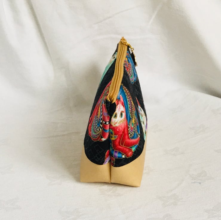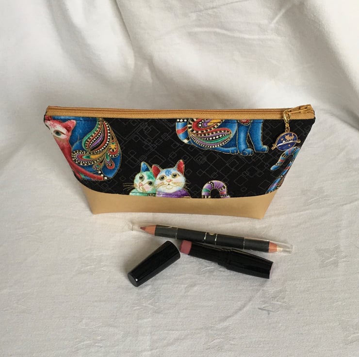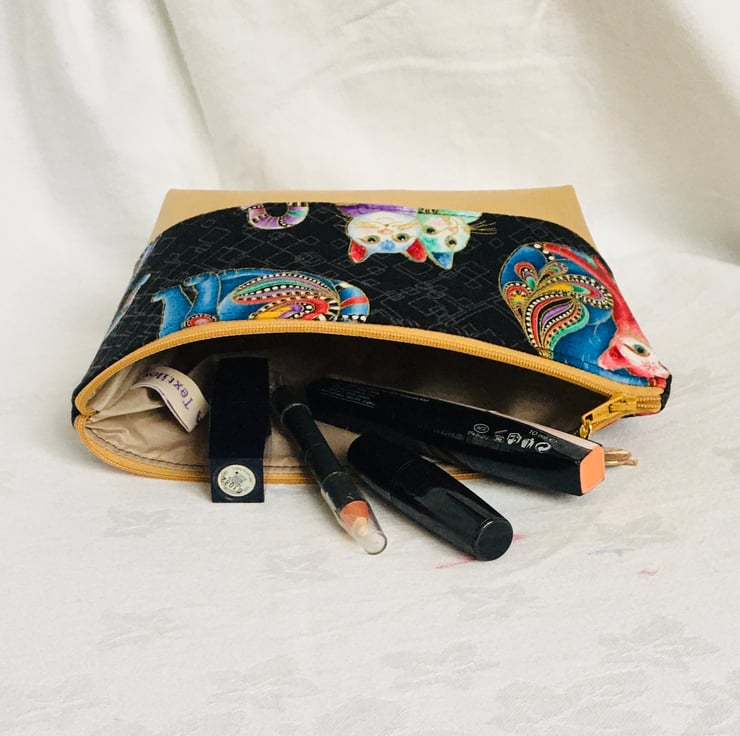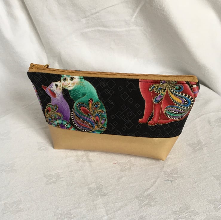 This bag has been made from quality cotton fabric with cat print on a black background for the top of the bag, with soft gold faux leather at the base and finished with waterproof lining for ease to wipe clean. A real unique, one of a kind and stunning looking cosmetic bag.