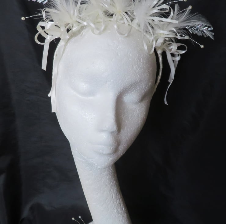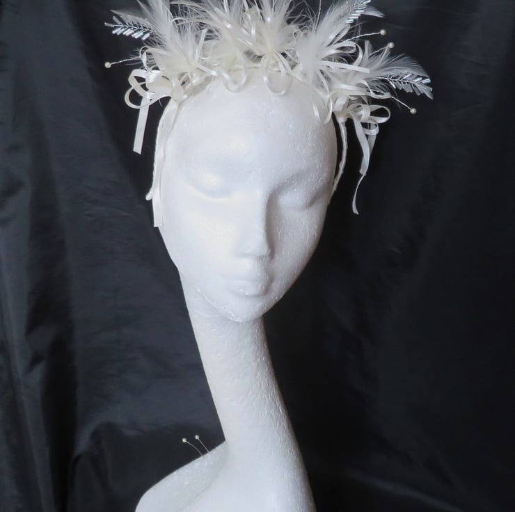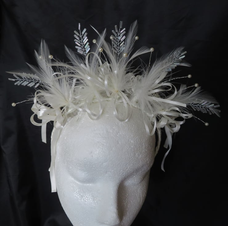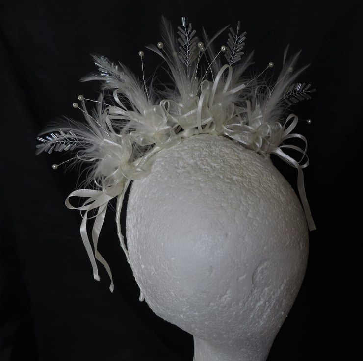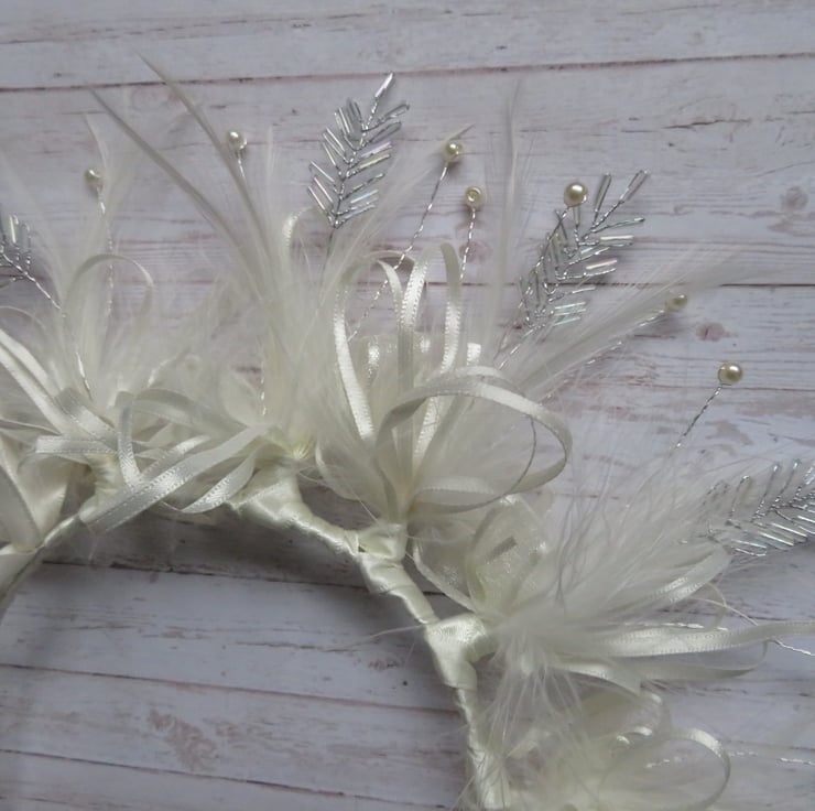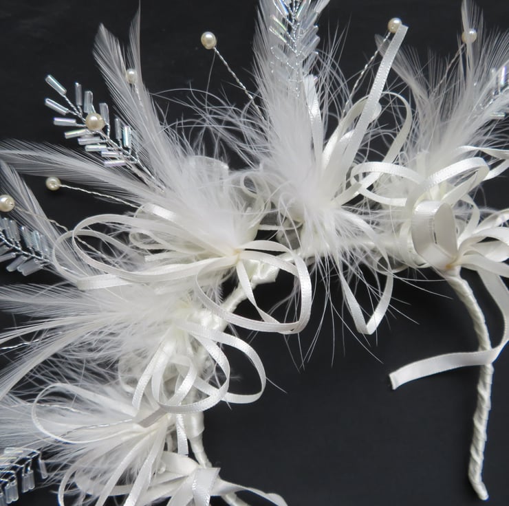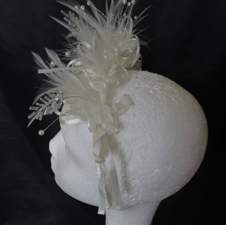 Created with gathered bunches of a beautiful bugle bead leaf embellishment, ivory hackle & fluff feathers, ivory satin shoestring bow loops and ivory satin edged organza bows at the back.