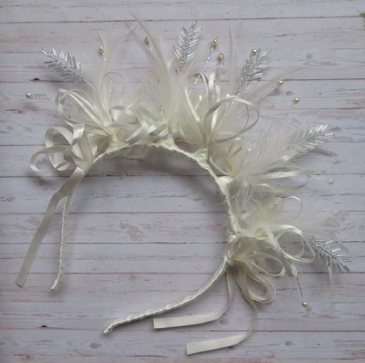 Finished with two wider ivory satin bows with trails at either side, and the thin metal headband hand wrapped with more ivory satin ribbon.