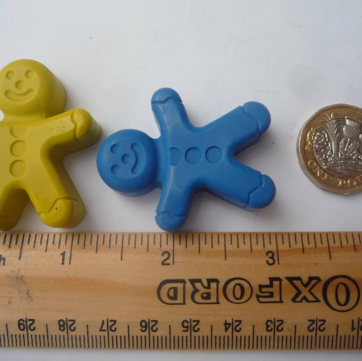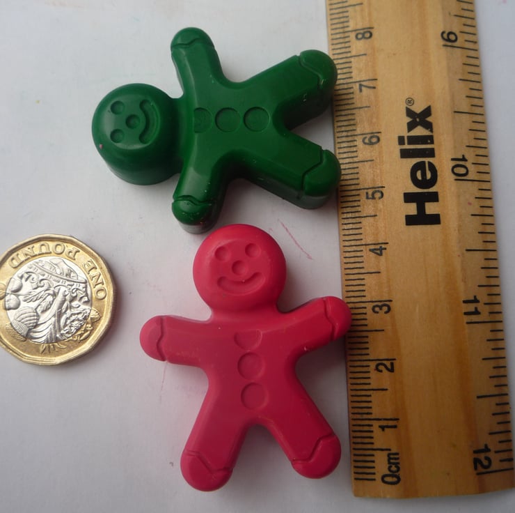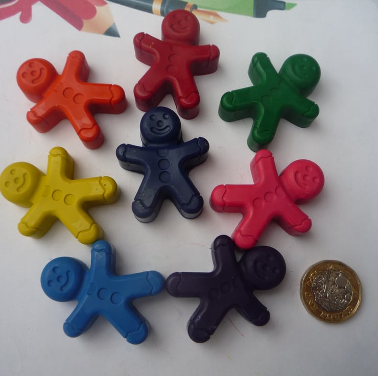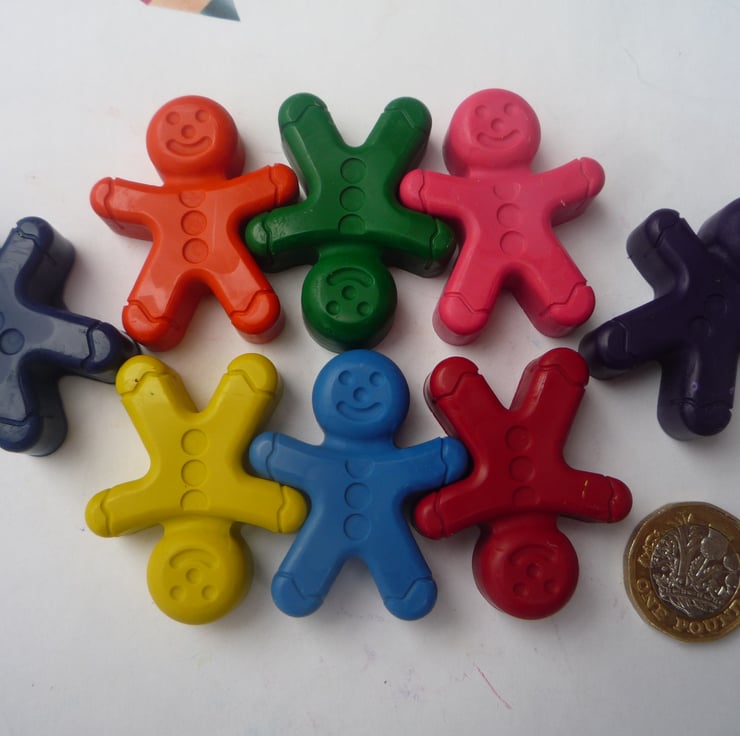 lovely little gingerbread shaped novelty crayons. ideal gift for children for birthday or parties. 8 crayons in assorted colours.