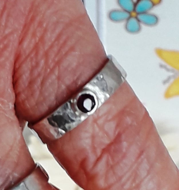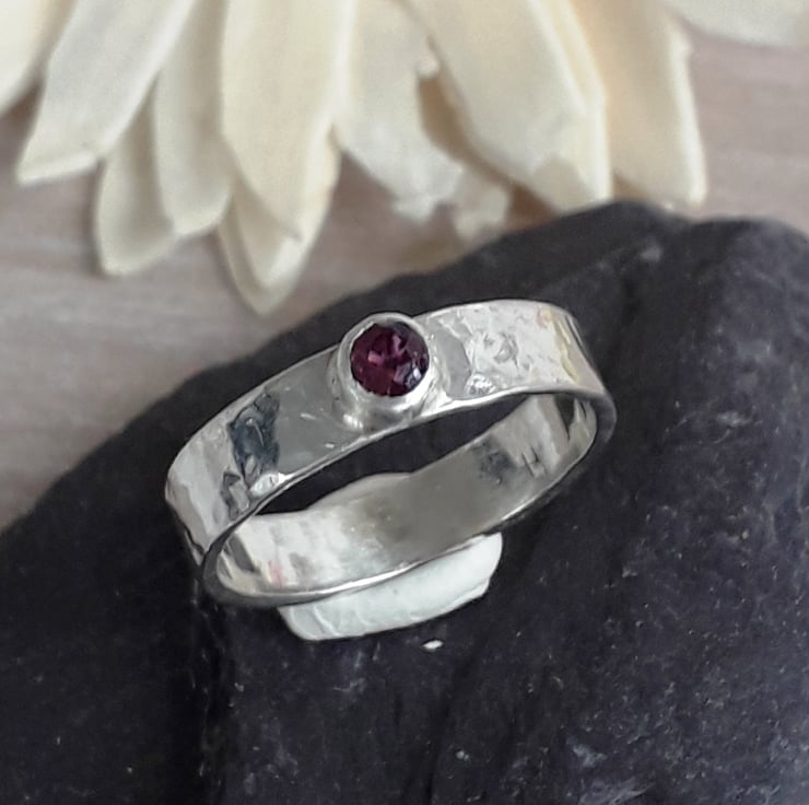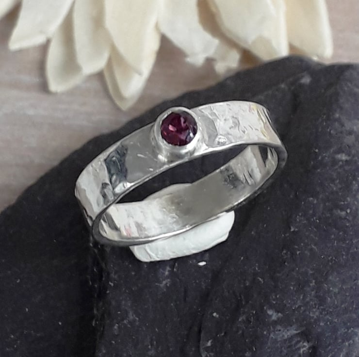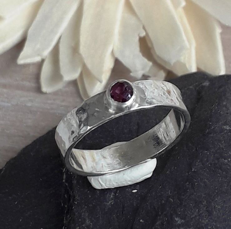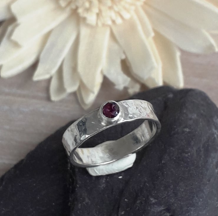 A beautiful 3mm plus size faceted natural ruby has been set into this 4 mm wide lightly textured Sterling Silver band ring.