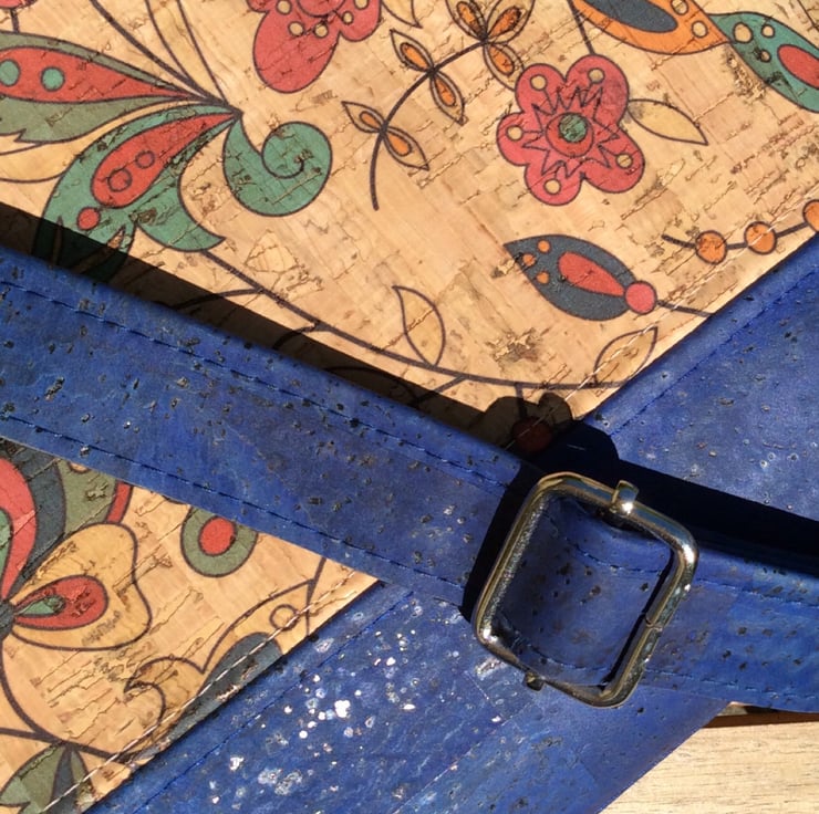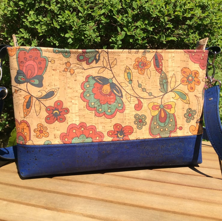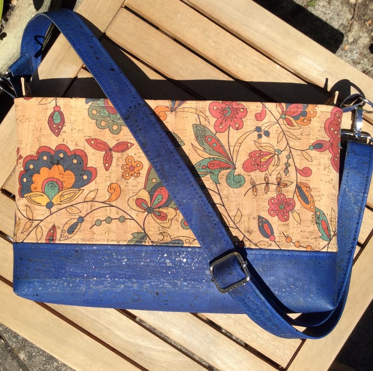 A crossbody bag handmade from my own design using a floral print cork fabric and fully lined with cotton fabric. It has a zip closure and an inner zip pocket. The generous strap is adjustable allowing the bag to be worn as a cross body or shoulder bag.