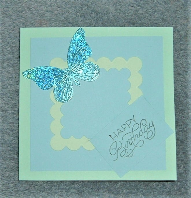 the base card stock is pale green and has been embellished with a butterfly and the greeting "Happy Birthday"
