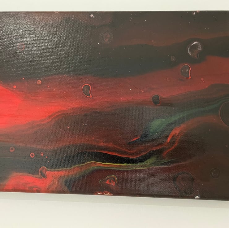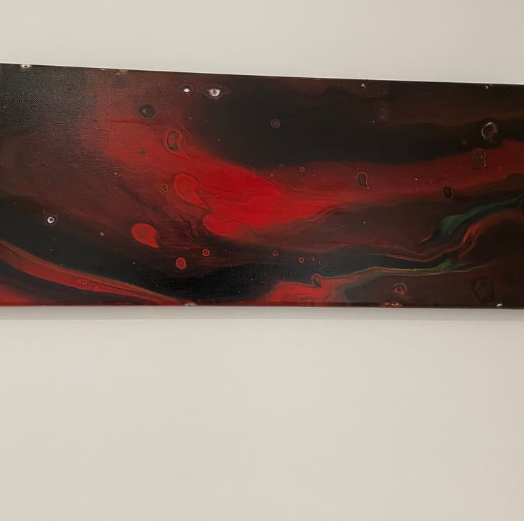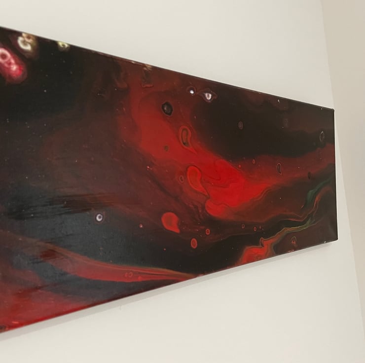 20x8” cotton stretched canvas. Deep red and dark complementary tones. Canvas is coated, backed and is ready to display straight away with D ring fastenings and cord. Photos are taken demonstrating the hanging position.