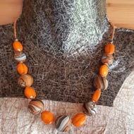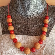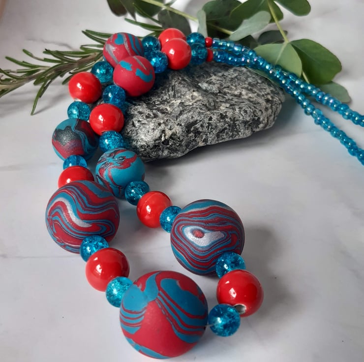 An unusual combination of turquoise and poppy red polymer clay are featured in this handmade necklace.