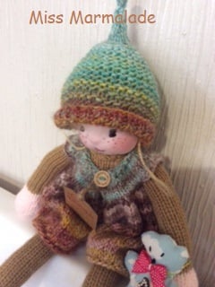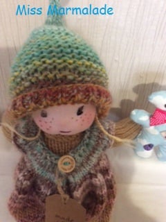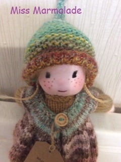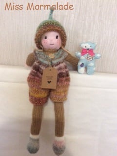 Miss Marmalade just cannot wait to meet her new best friend. She is a very pretty Waldorf type doll and measures approximately 39cm (15”). She is hand knitted from various types of wool in a pretty pale caramel colour with a fabulous striped romper suit to match. The Romper suit is removable. Her shoes match her outfit in duck-egg blue and pink with bright white socks. She also has a matching bobble hat to keep her warm in winter weather, which she can take off if she gets too warm. She has a lovely embroidered face with a cheeky smile and button nose with lots of little freckles. Her hair has been crocheted from pretty blond long fibre mohair wool which she wears in plaits over each shoulder.