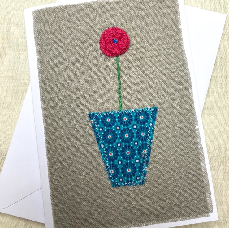 This pretty hand embroidered coral pink flower sits in a blue retro cotton flower pot. The flower is sewn onto natural linen and mounted on a white greetings card 10.5 cm x 15 cm (4" x 6"), The card has been left blank inside for your own message.