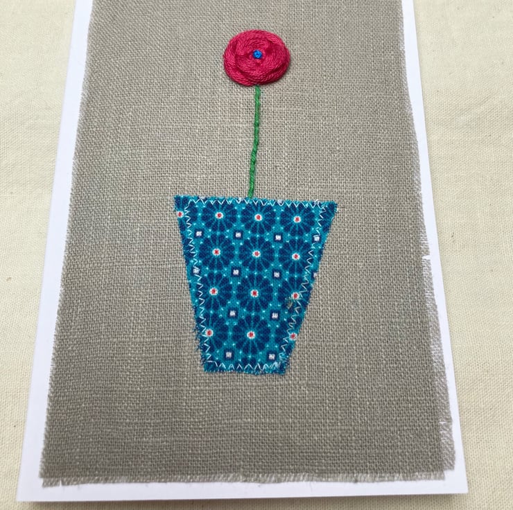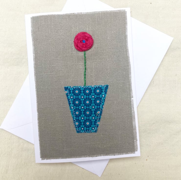 This pretty hand embroidered coral pink flower sits in a blue retro cotton flower pot. The flower is sewn onto natural linen and mounted on a white greetings card 10.5 cm x 15 cm (4" x 6"), The card has been left blank inside for your own message.