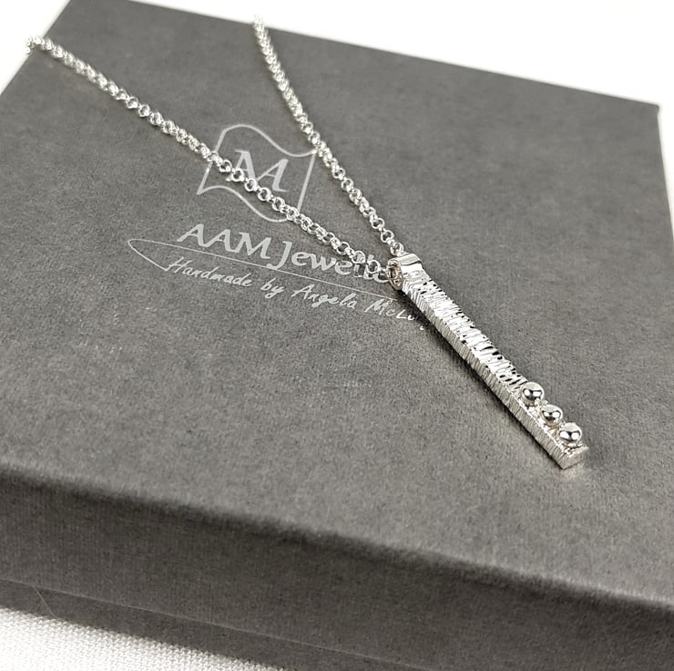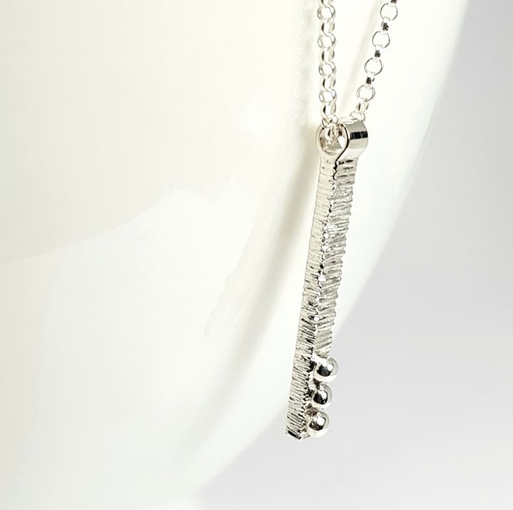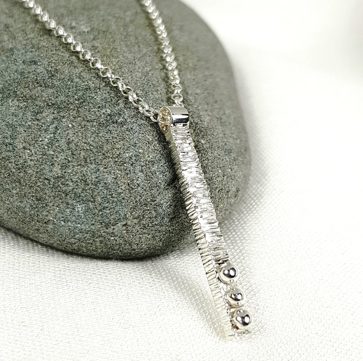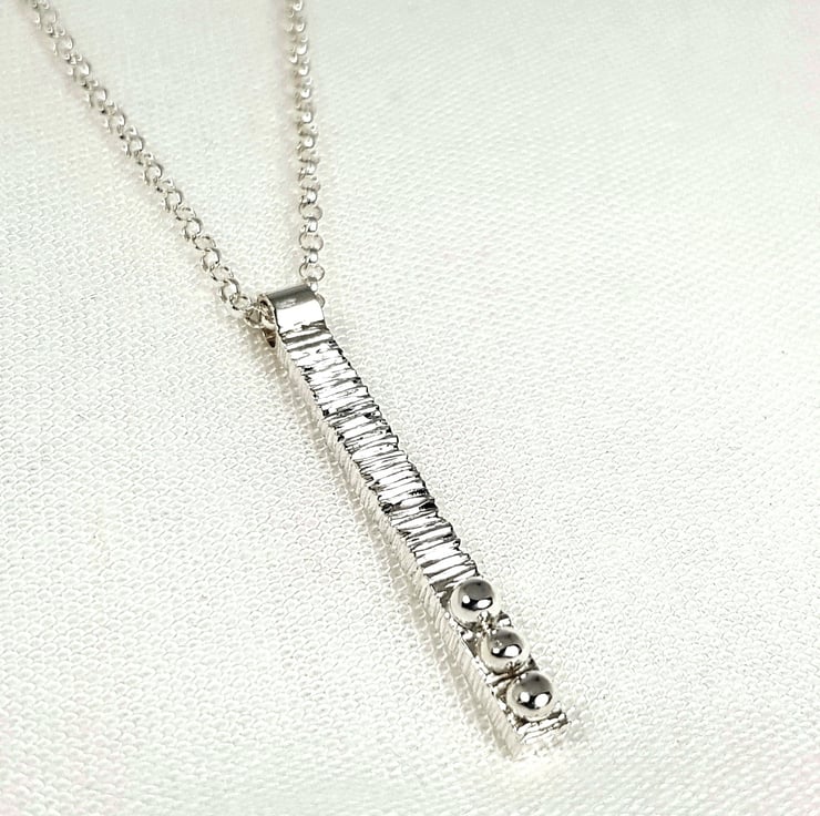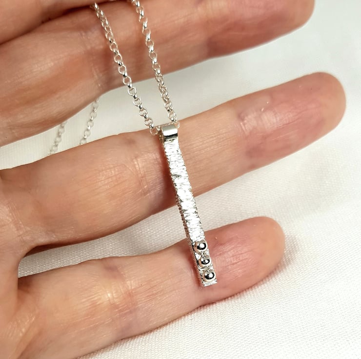 A contemporary sterling silver bar necklace with a hand textured finish on the front and sides and featuring three little silver balls to add a whimsical finishing touch. The pendant hangs from an 18" sterling silver chain.