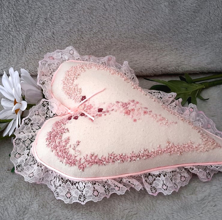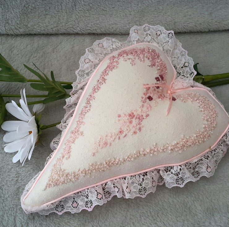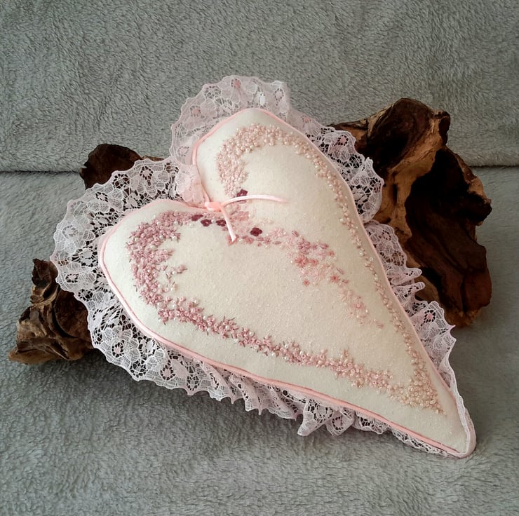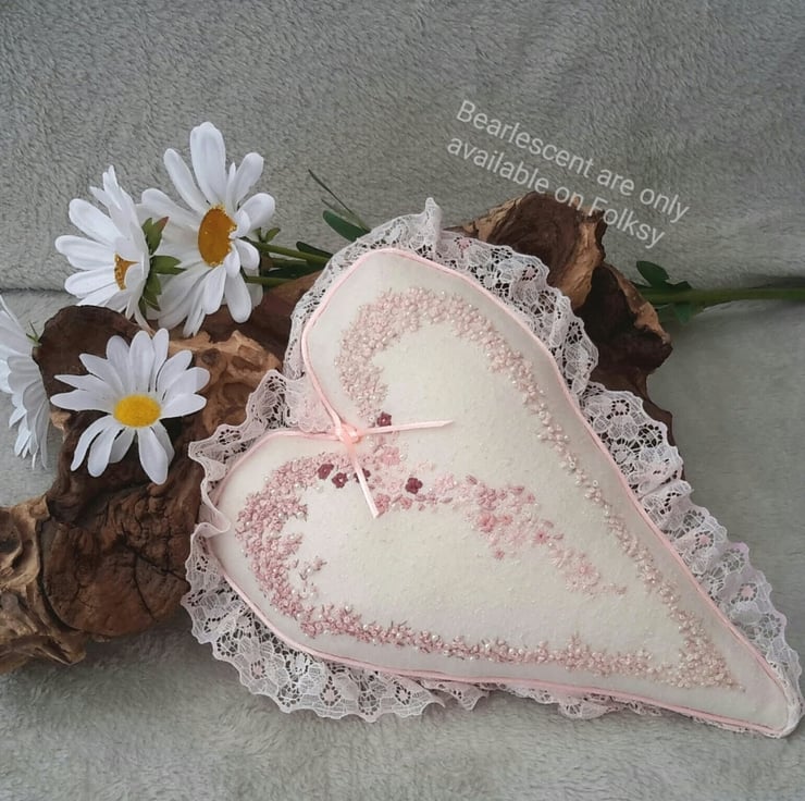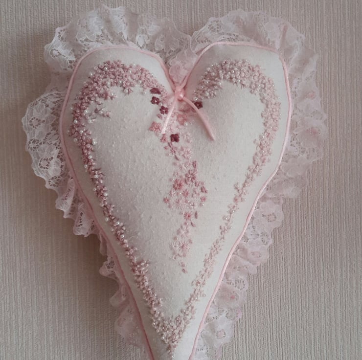 Beautiful hand embroidered heart, a large embroidered and beaded hanging heart, cushion or decorative item in heritage style. Designed and created by Bearlescent.Was £55 now £45