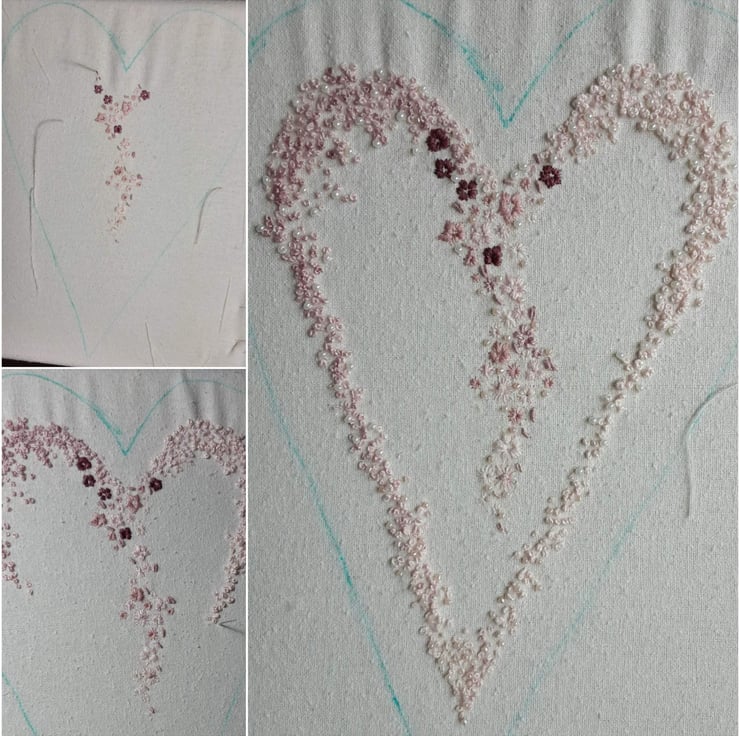 Hundreds of French knots follow the heart shape with embroidered flowers to the centre trailing down into the middle of the heart.
