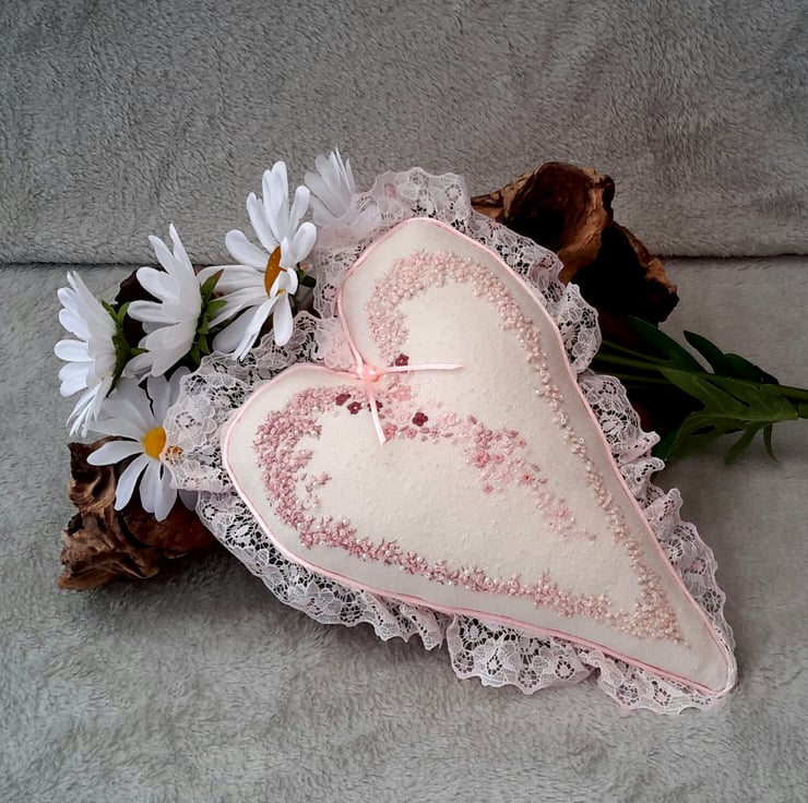 Taking over 4 days to make this heart has been completely hand sewn using various perle cottons and embroidery threads in numerous shades of pink. Green stems have been embroidered throughout the french knots.