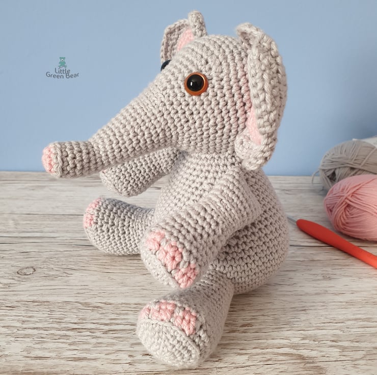 Eva, the adorable little elephant, works hard during the day gathering food – tasty leaves, grasses and bark. After a hard day’s work, she rushes down to the local waterhole where she loves to swim, sometimes using trunk as a snorkel! No cannonballing though because she can’t jump… She sits 7 inches tall (when made with the recommended materials).