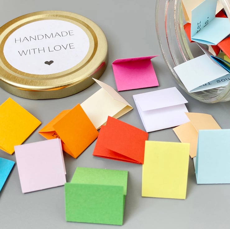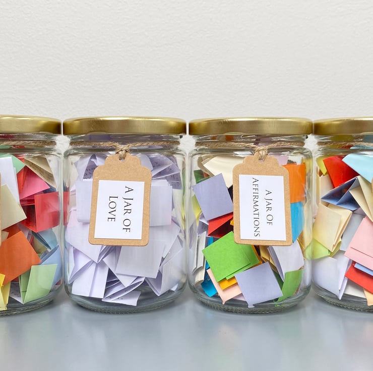 Each jar contains 50 - 55 individual handmade quotes. The wording is printed in black on a mix of different coloured card pieces. The Jar of Love quotes are printed on white. The glass jar measures 11cm x 7.2cm.