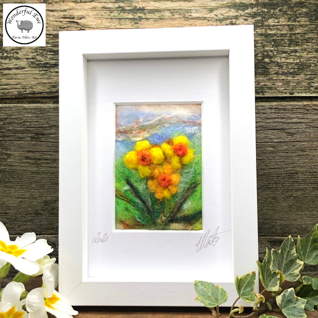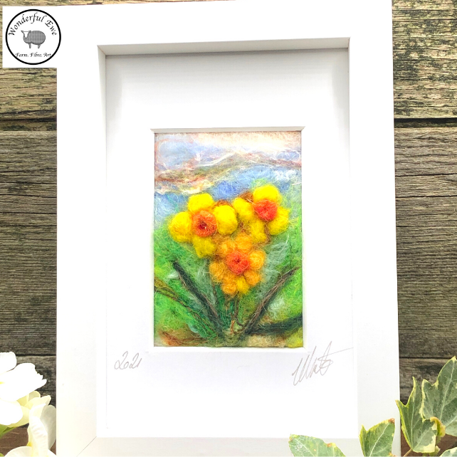 This miniature felt painting of Spring Flowers is full of texture, fibres and bright spring colours.