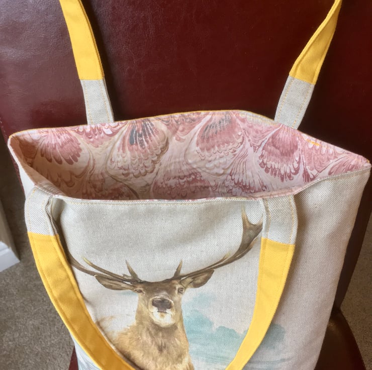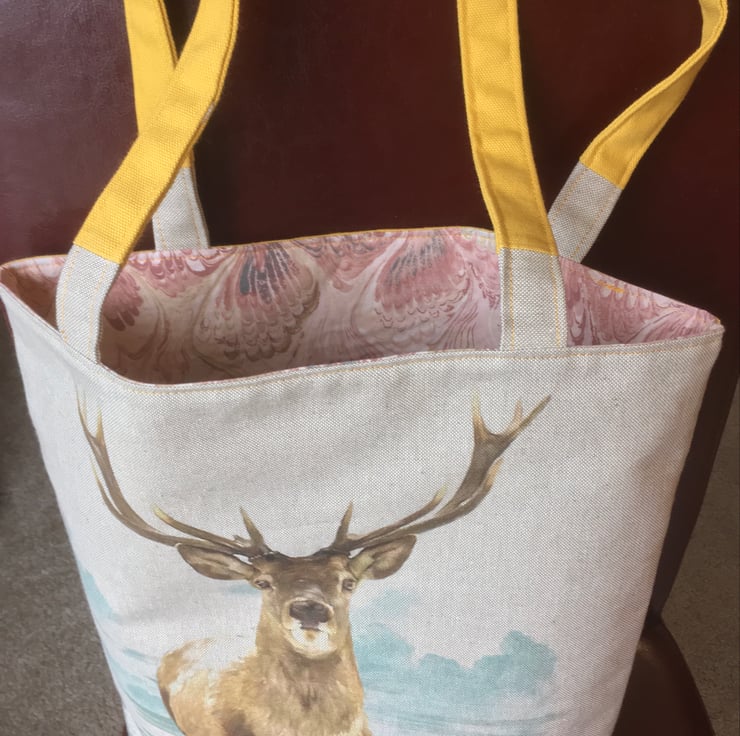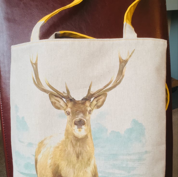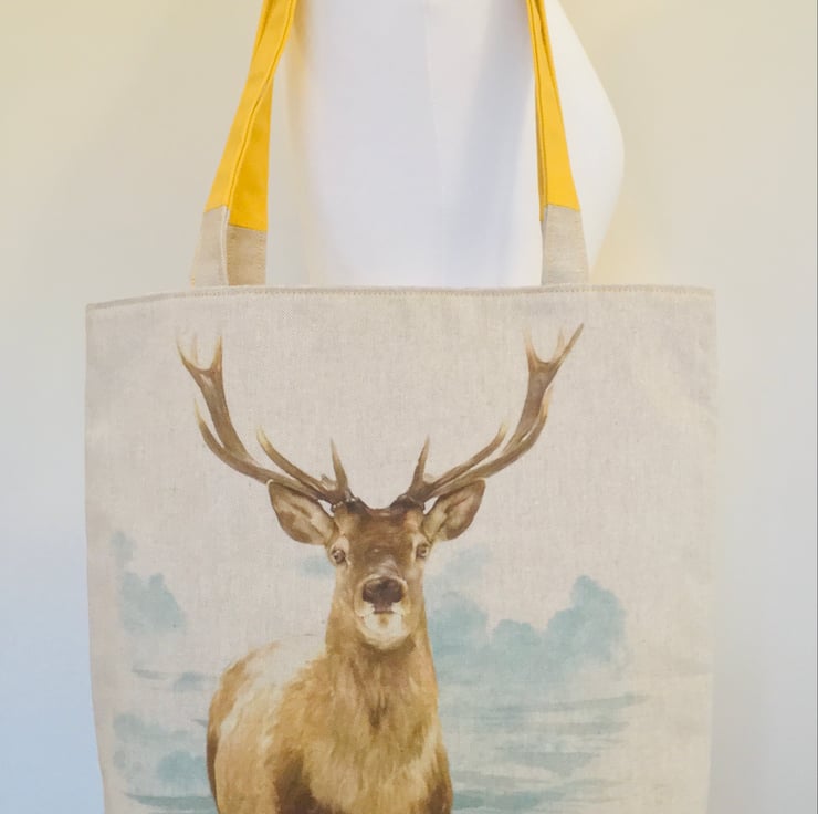 A large tote bag make from cotton rich linen and featuring a magnificent stag.