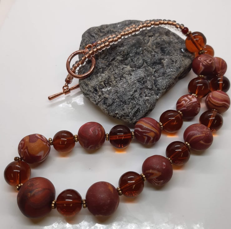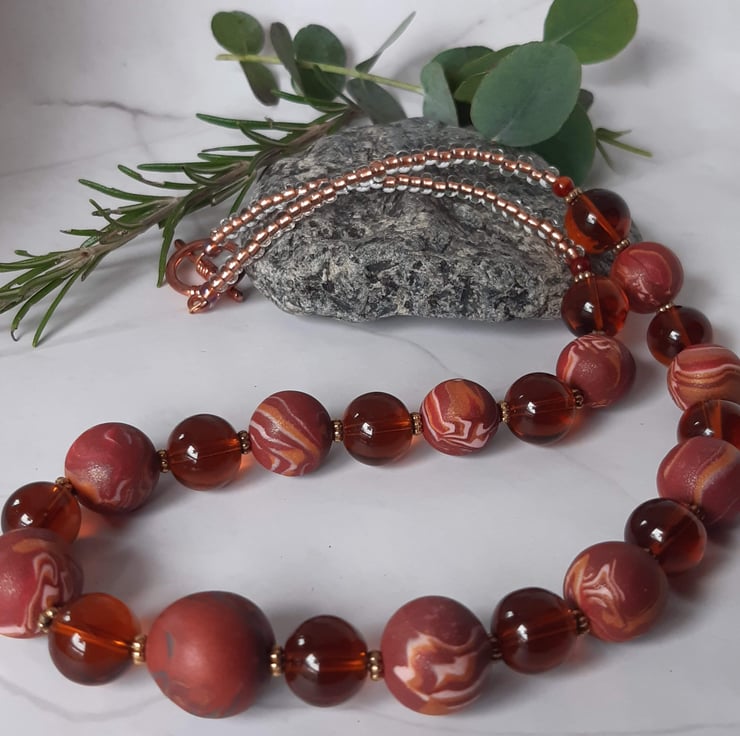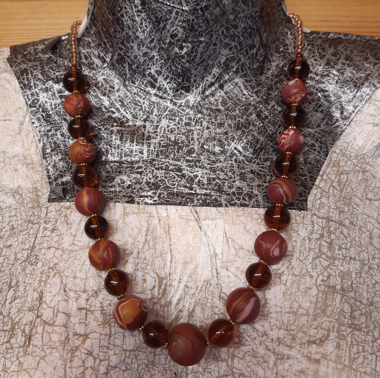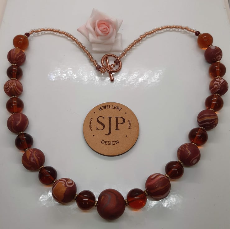 This necklace features an assortment of handmade polymer clay beads featuring rosewood, copper, dark salmon, pink, cream and gold clay with a hint of sparkle on some of the beads.