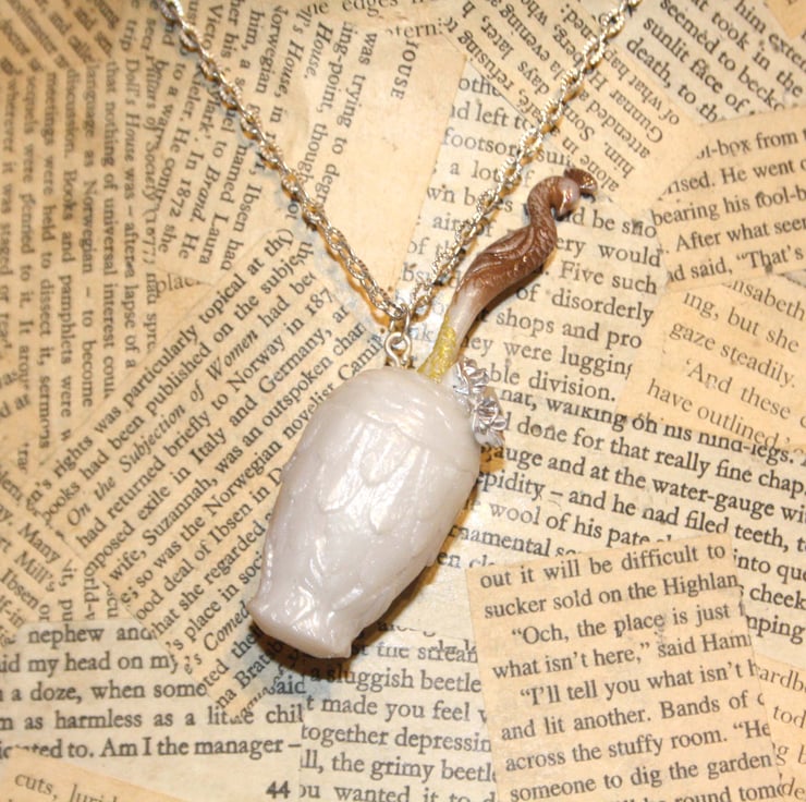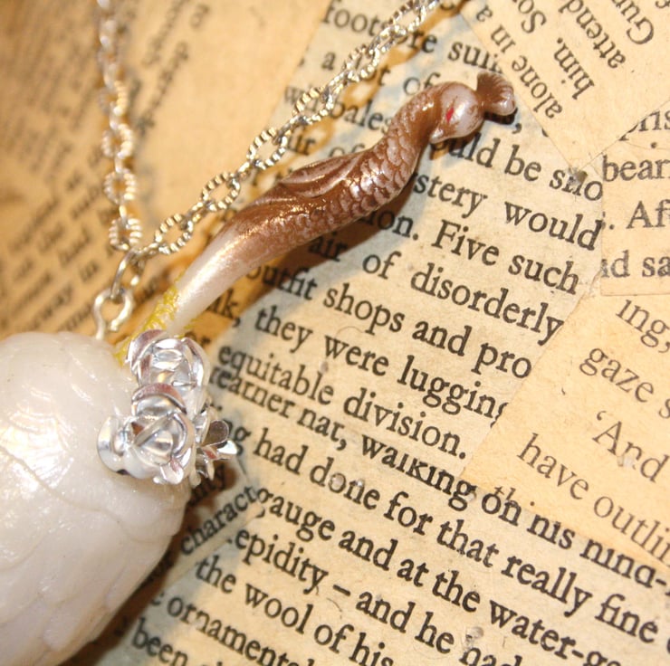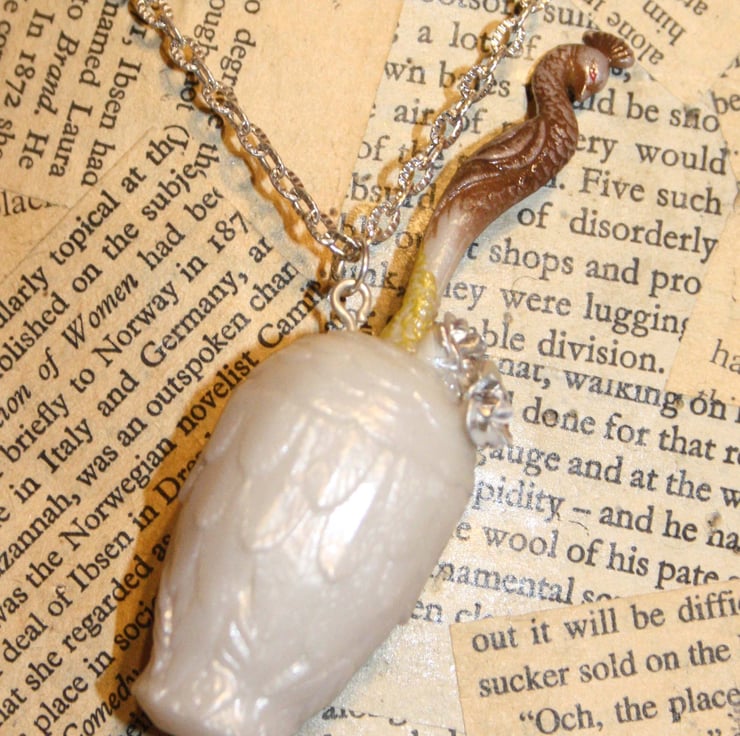 From a silver tone chain hangs Plumette, the feather duster from the classic 'Beauty and the Beast'. Plumette is in a classical bird design, with a pearl finished to her feathers. A trio of silver tone metal roses have been added, harking back to the fairy tale.
