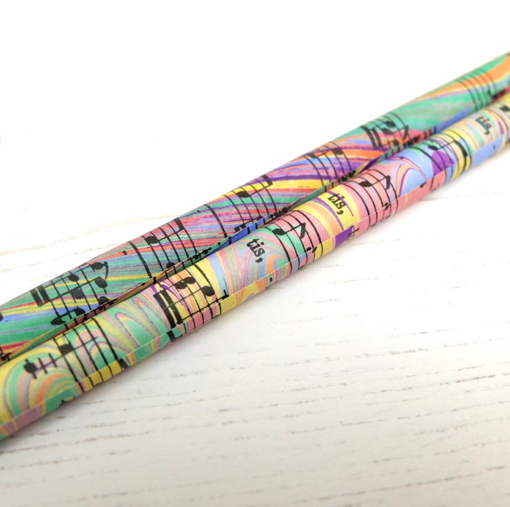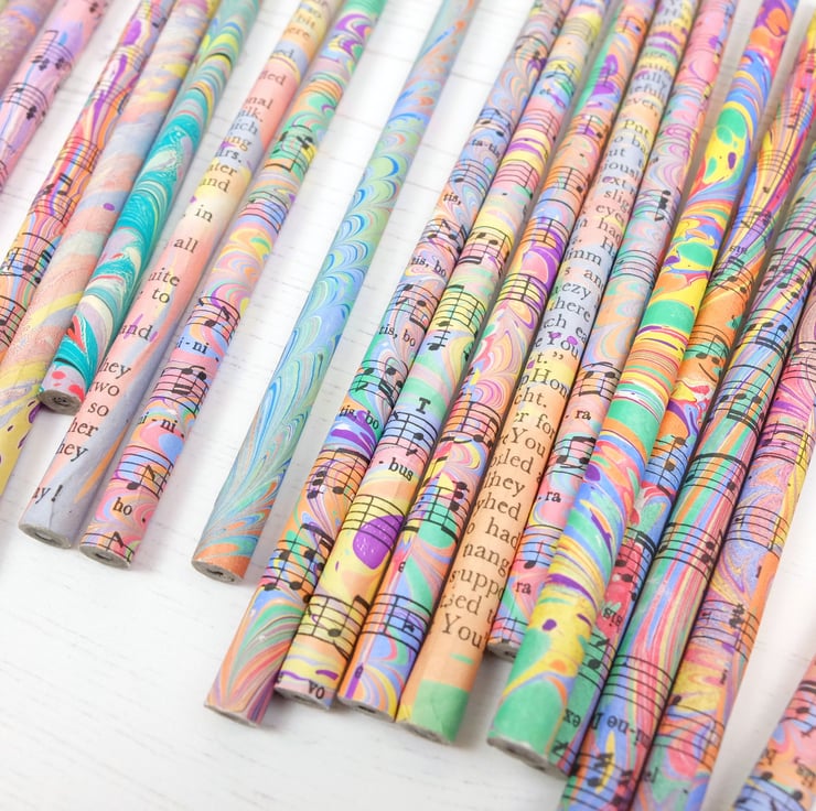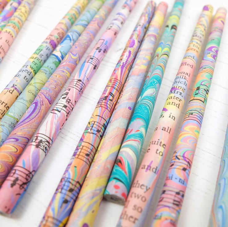 These pencils are made from recycled newspapers and the marbled paper I use to cover the pencils are from strips that I place on my tray as part of the cleaning process to remove excess paint. I use starch paste to glue the paper to the pencils to minimise environmental impact.