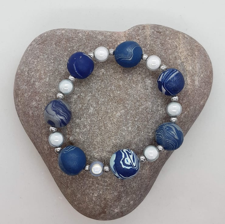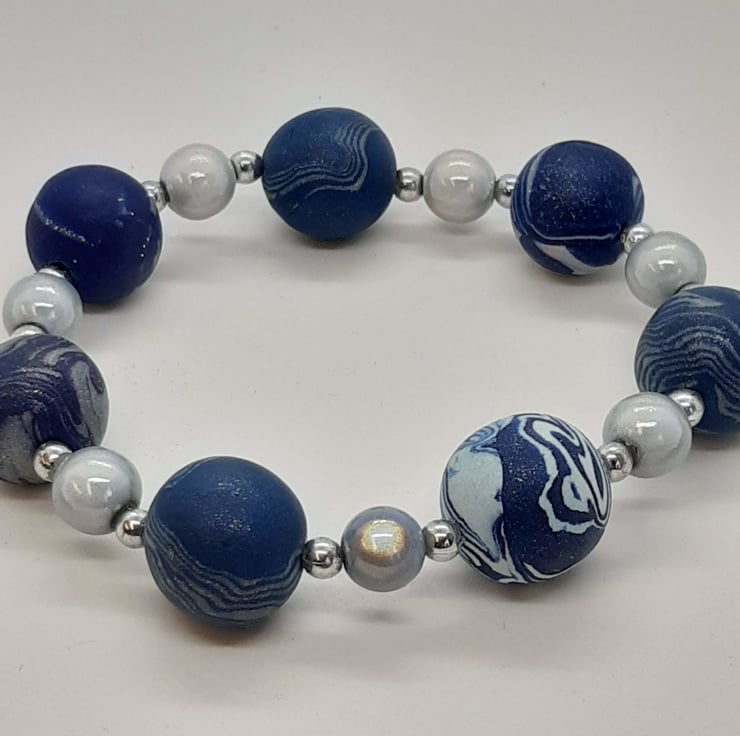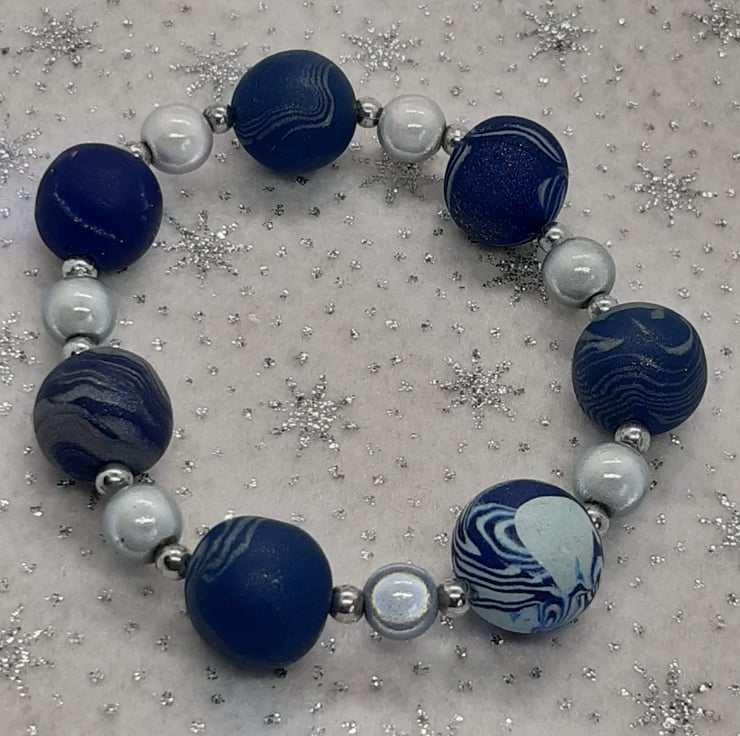 The bracelet features 15mm handmade polymer clay beads in a navy, light blue and silver swirl pattern together with 8mm smokey grey miracle beads and small silver plated spacer beads.