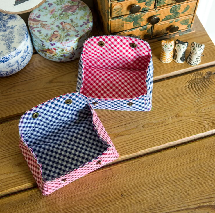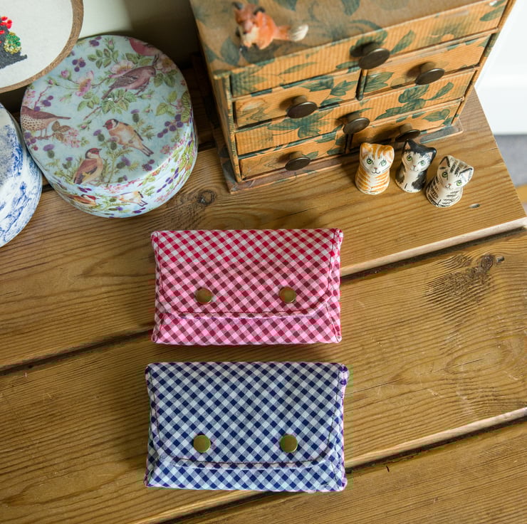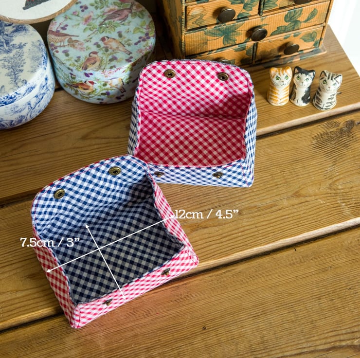 The pouches are made with woven cotton ginghams in dark blue and red, which I've cut on the bias. One has red on the outside and is lined with blue and the other hasblue on the outside and is lined with red. Gingham always reminds me of summer and picnics - and the Great British Bake Off!