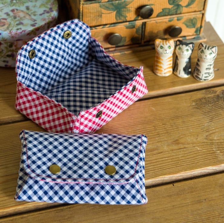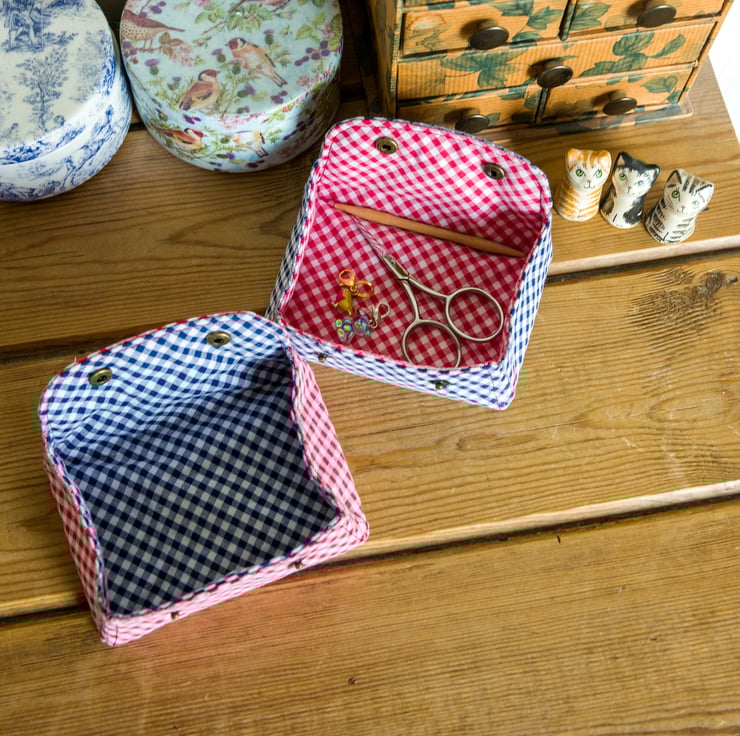 The outer and lining of the pouch have both been interfaced with woven cotton and the outer also has a layer of fleece added for a little padding. The pouch is mainly machine stitched and top stitched, but the 'tray' shape is made by hand stitching the edges together. The finishing touch is the addition of a couple of metal press studs to keep everything secure inside.