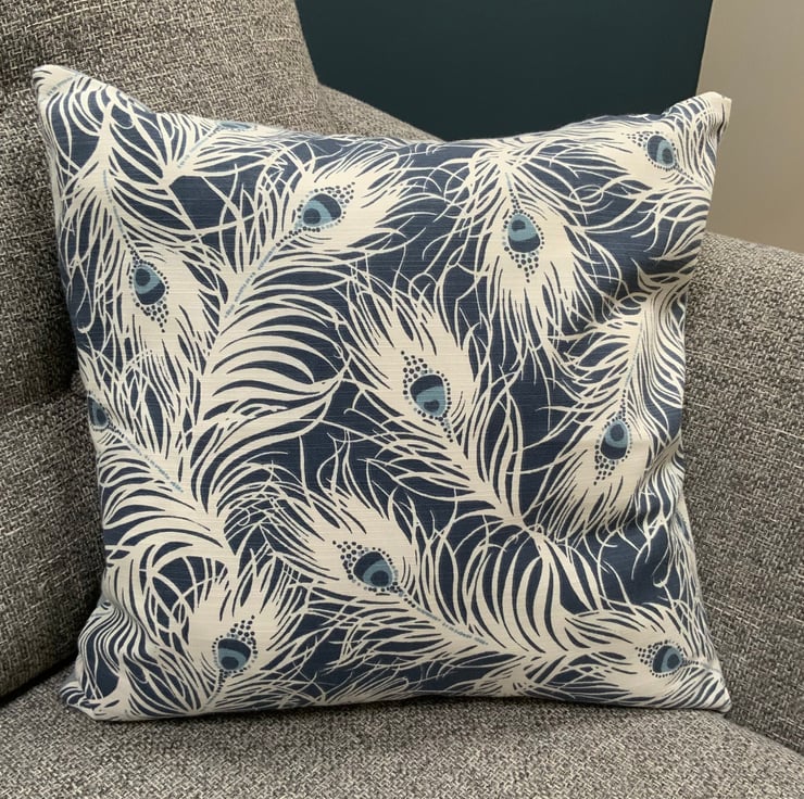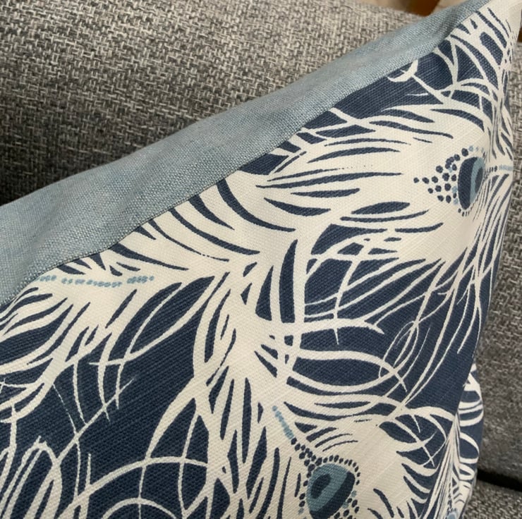 Blue cotton peacock feather print front, blue woven back. Zip fastening