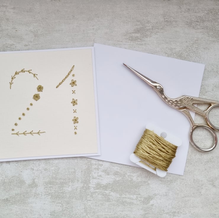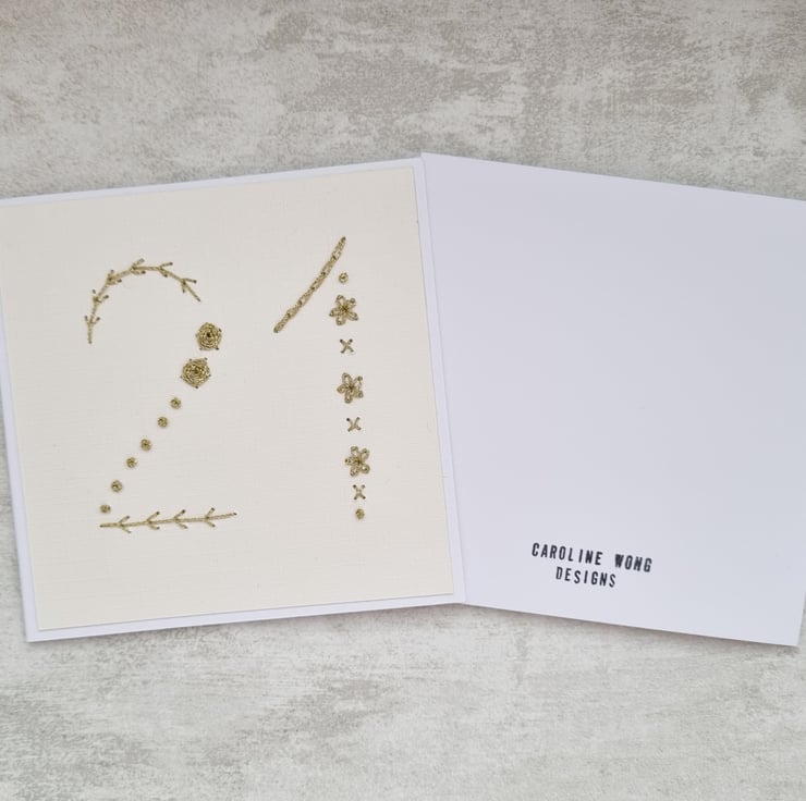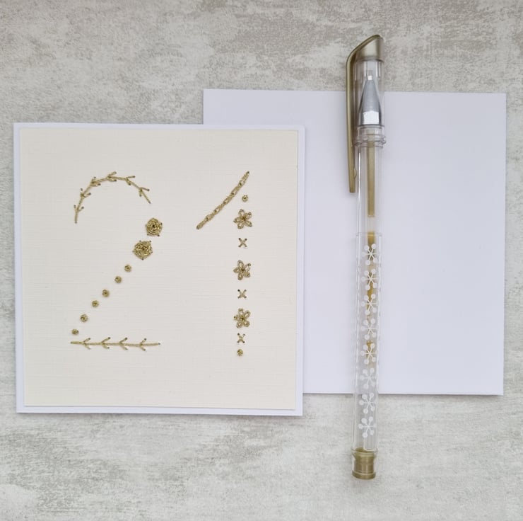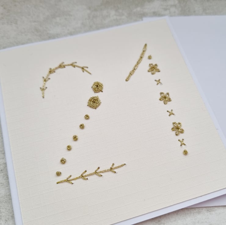 - Hand stitched with shimmering gold metallic threads, the card captures light beautifully and gives it a tactile feel.