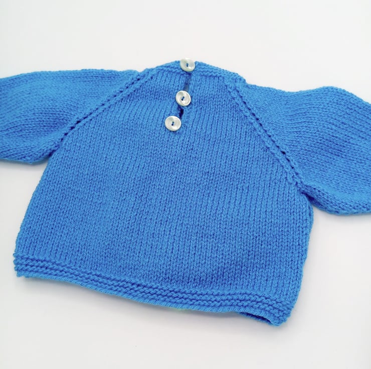 A really cute hand knitted round neck jumper, with a dinosaur motif, for children up to 3/4 years made using double knitting yarn. It is in stock in the blue colour shown with the green dinosaur in a size to fit a 0 - 3 month old with a 16 inch chest. It can also be made for you in a size and colour of your choice. Please see below for the available sizes and prices and state the colour required when you order. Please allow approximately 2 weeks processing time for the jumper to be made and posted to you.