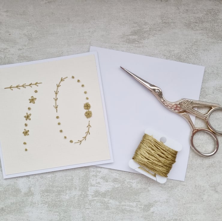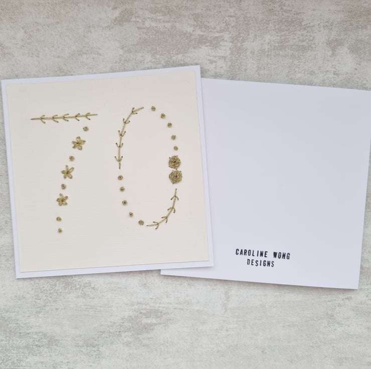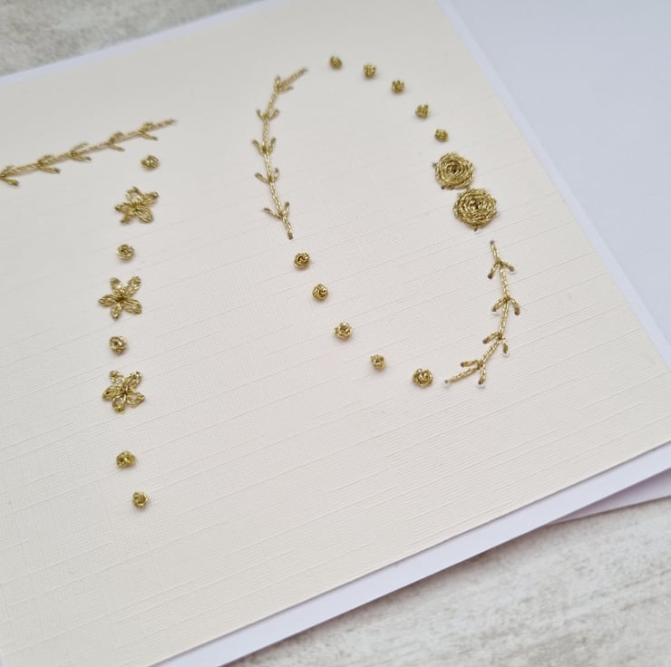 - Hand stitched with shimmering gold metallic threads, the card captures light beautifully and gives it a tactile feel.