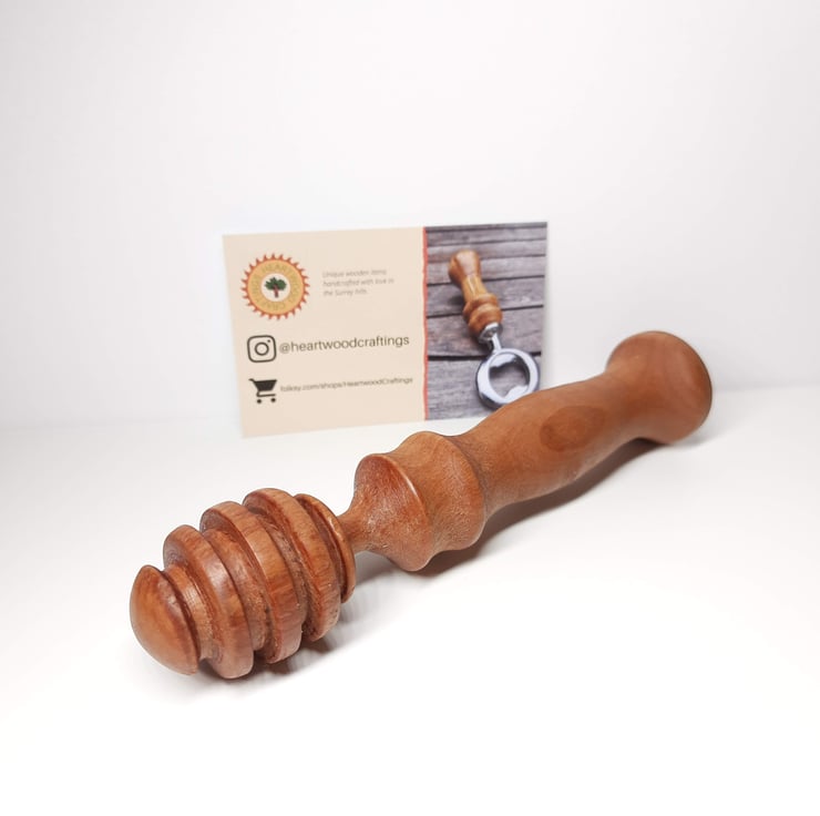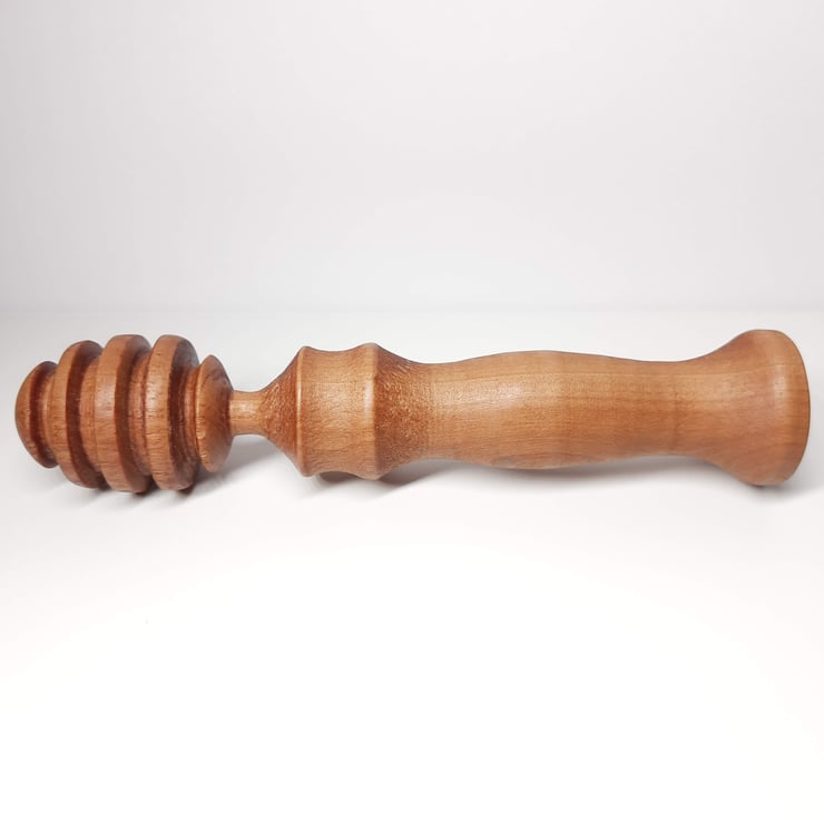 This honey dripper is turned from beautiful pear wood with a lovely deep pink colour and stunning straight grain. The wood was first roughed down to cylindrical and then the details and divets at the end done mainly with a skew chisel and fingernail gouge.
