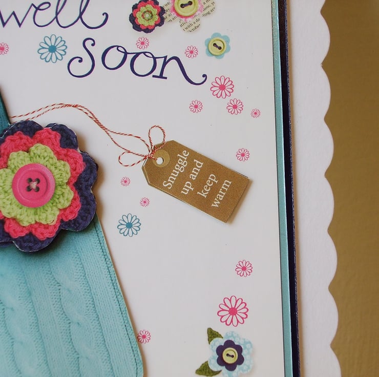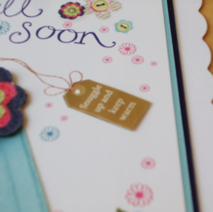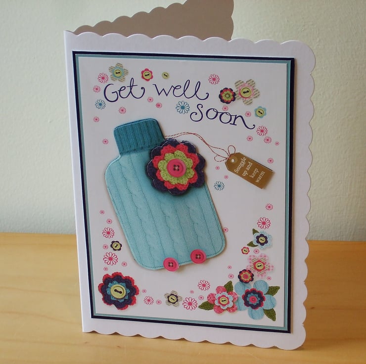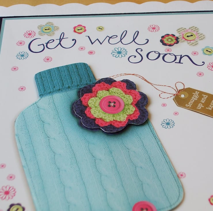 The topper image has been mounted onto 2 layers of paper, one teal and one navy blue before being placed on a white card blank which has a decorative scalloped edge. I've taken 2 identical images and hand-cut the hot water bottle from one and flower from the other then placed them onto the base image using 3D glue to give dimension.