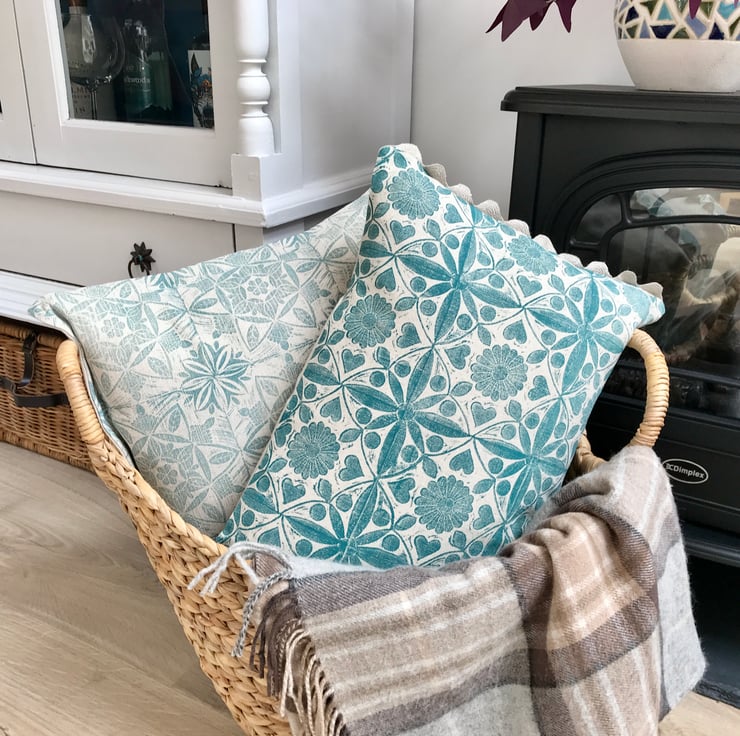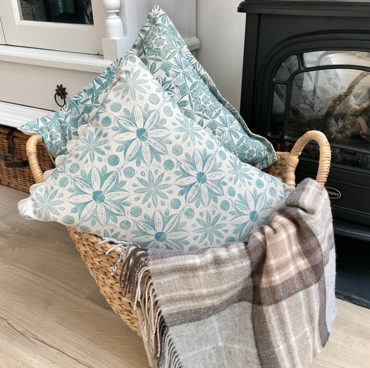 I hand carve my unique designs on to lino blocks then hand print on to fabric woven locally in Fife. I mix the Eco-Friendly water-based inks in small batches, therefore there may be a variation in colour between subsequent batches