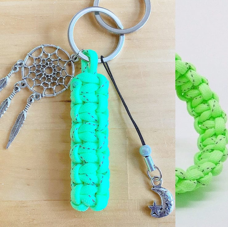 This green Paracord fob measures approximately: 7cm by 2cm and glows in the dark.