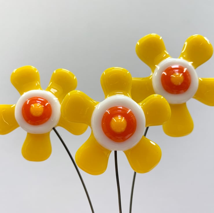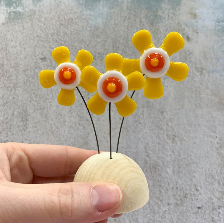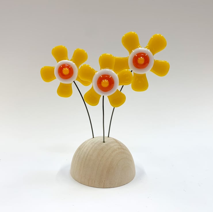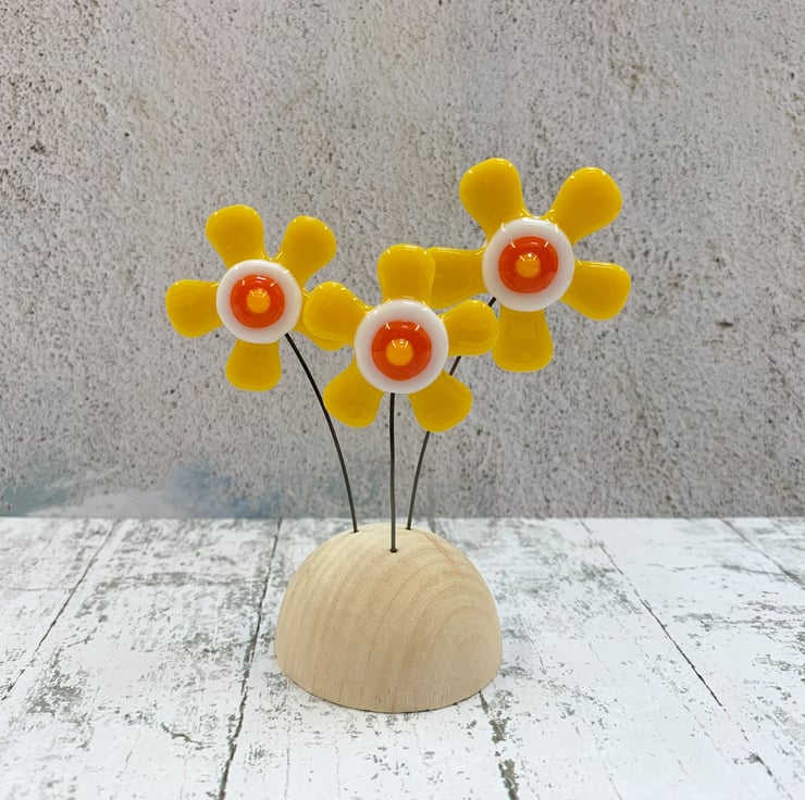 Fused glass freestanding piece on a solid wood base. This dinky sculpture combines yellow, orange and white fused glass flowers, a solid wood base and wire stems. This looks lovely either on a window sill or on a mantelpiece. Each sculpture is completely unique.