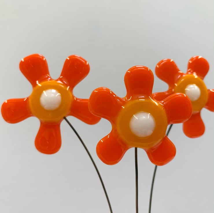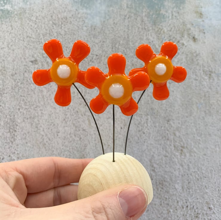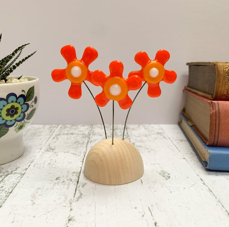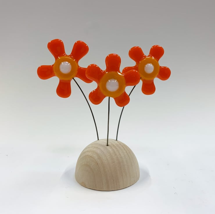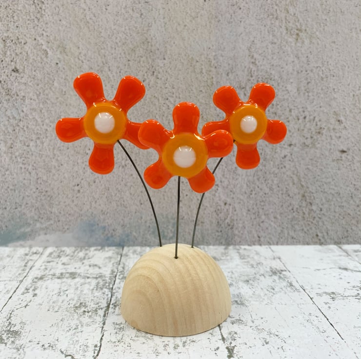 Fused glass freestanding piece on a solid wood base. This dinky sculpture combines orange, yellow and white fused glass flowers, a solid wood base and wire stems. This looks lovely either on a window sill or on a mantelpiece. Each sculpture is completely unique.